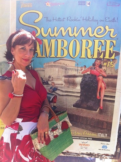 Se dovessi dare un voto alla mia esperienza riguardo la 15° Ed. del Summer Jamboree di Senigallia sarebbe un dieci pieno. Ho vissuto un’esperienza travolgente e mi sono sentita “protagonista” in queste giornate festose e perfettamente a mio agio con il look anni 50 che indossavo: gonna a ruota fiorata, zoccoletti di legno e borsa di paglia tutto rigorosamente vintage!