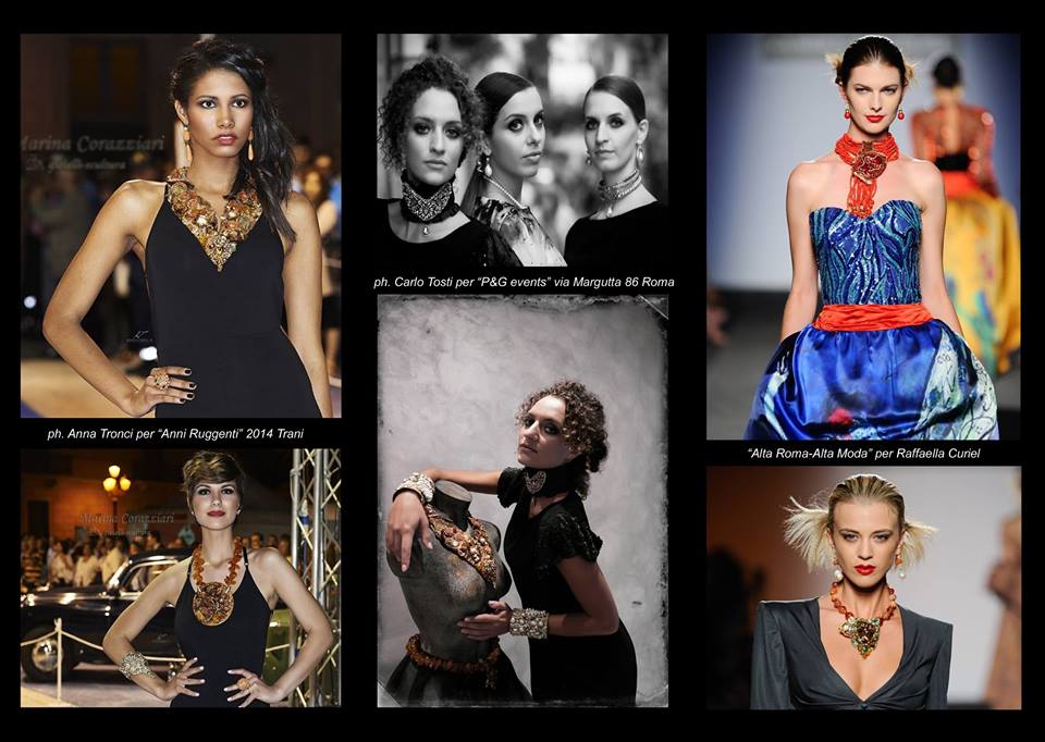 Marina Corazziari può vantare un Curriculum di tutto rispetto con oltre 20 anni di lavoro alle spalle, oltre 200 mostre personali in Italia ed all’estero, tra le più memorabili voglio menzionare quella avvenuta presso il Museo del Grand Palais a Parigi nell’ 88 per la Biennale des Femmes , a Savona e a Bari al Palazzo della Provincia , a Firenze al Palazzo della Signoria, a Roma alla Biblioteca Angelica. Espone nel Salone degli Affreschi all’Universita’ di Bari, sfila le sue creazioni alla 54° Biennale di Venezia al Teatro Piccolo all’Arsenale … In corso,fino all’8 febbraio p.v. la mostra “I gioielli del Mediterraneo” presso La Fondazione Roma – Museo del Corso in concomitanza con la Mostra dell’americano Norman Rockwel.