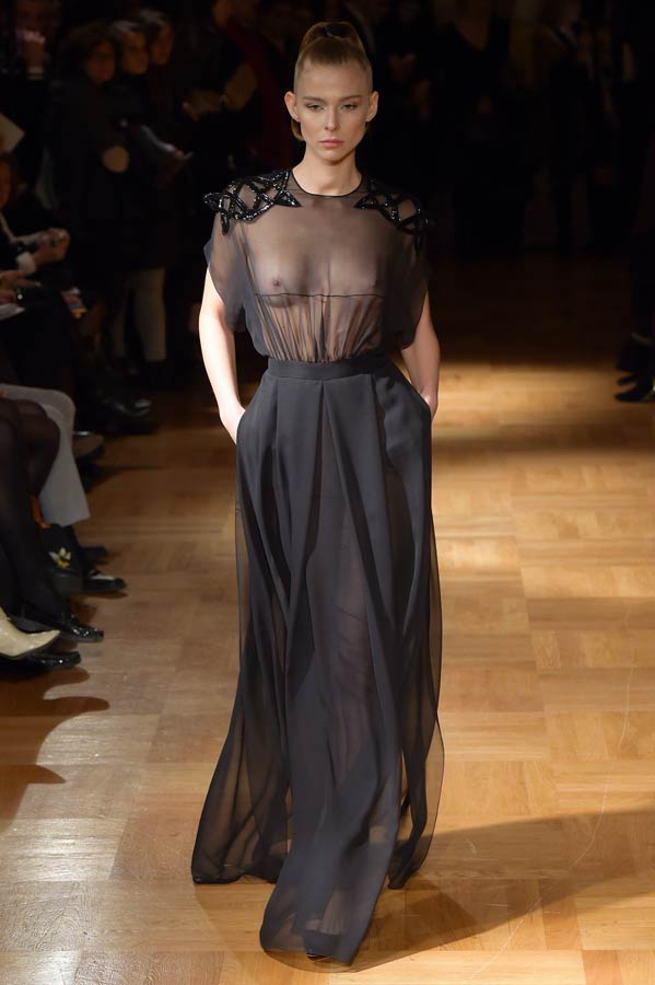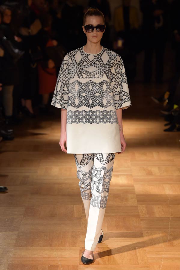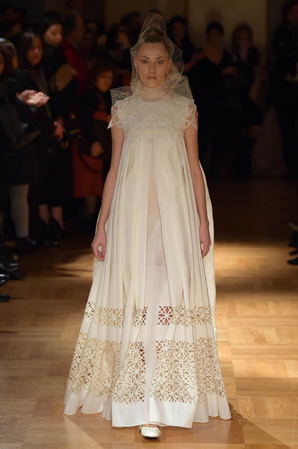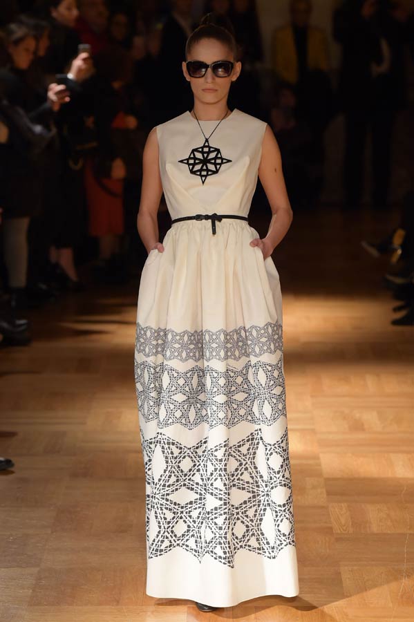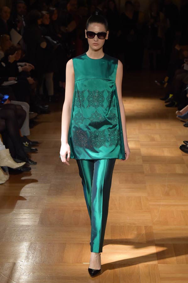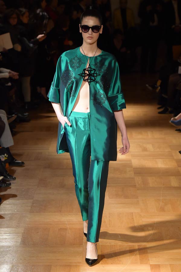Il Maestro ha interpretato nella sua collezione “Primavera-Estate” 2015 una donna sofisticata, ma al tempo stesso contemporanea, dinamica, audace, sensuale che ama indossare abiti dalle linee pulite ed essenziali. Abbiamo visto sfilare trenta outfits che rievocano gli anni ’50 e ’60 dal nero al bianco e al verde smeraldo. Per il giorno capi spalla, stile kimono di varie lunghezze, realizzati in mikado ed organze con stampe geometriche, pantaloni garçon ed hot pants proposti in svariate tecniche su diversi tessuti nobili come organza, chiffon, gazar, mikado, tulle e leggera pelle ecologica.