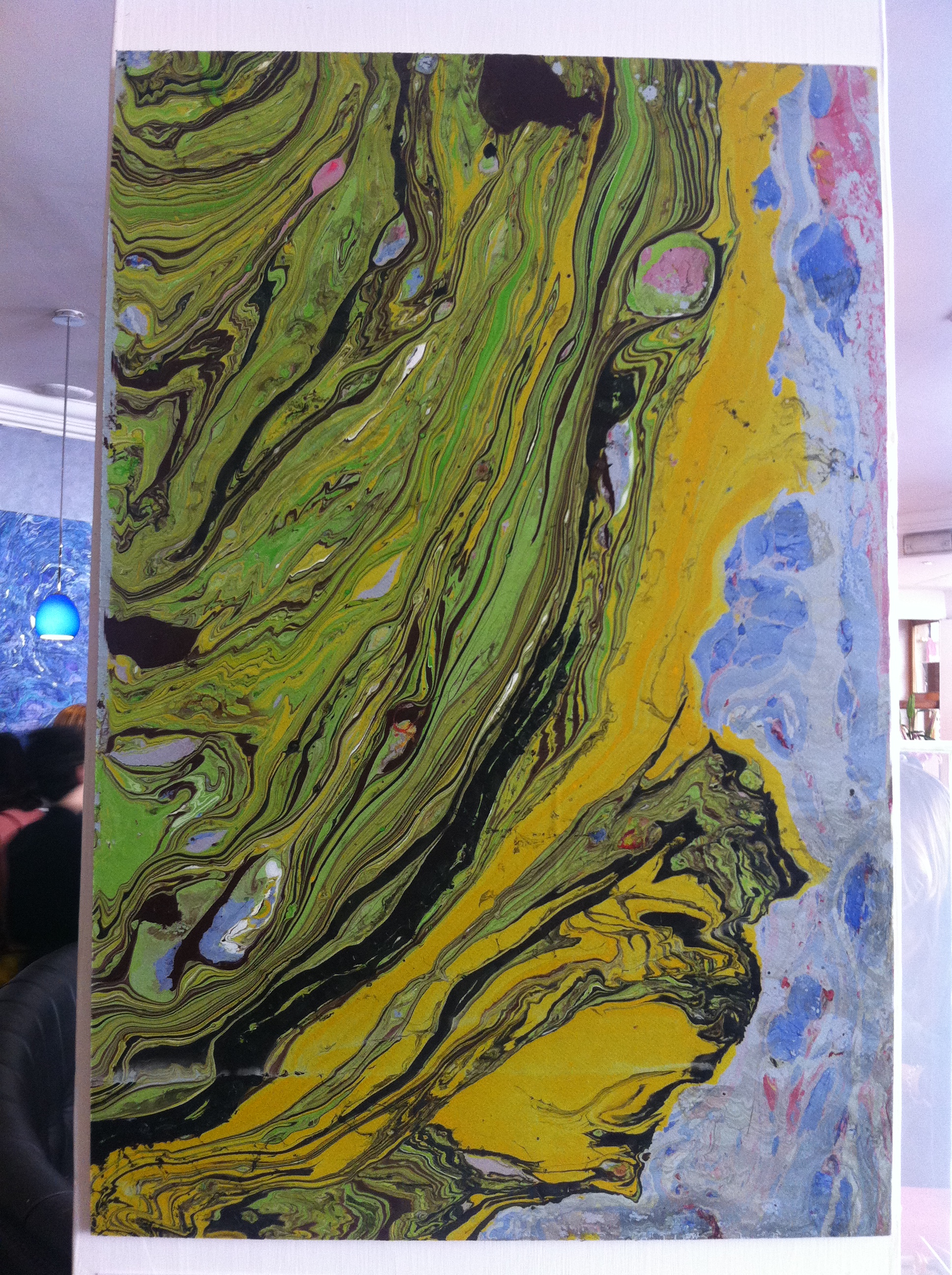 Curiosità, voglia di vedere dentro le cose, plasmare la materia…lasciare traccia di sé. Questo Danilo lo fa e lo ha fatto con la creazione di gioielli per la sua azienda Giamore e per tante altre aziende che chiedono il suo supporto artistico. Ma come giustamente evidenziava nel suo intervento la creatività non può essere prosciugata e ha bisogno di rigenerarsi. E’ quasi una catarsi quella che prova nell’esprimersi attraverso l’antica tecnica dell’Ebru* che scopre casualmente in un viaggio in Turchia che lo assorbirà a tal punto da impiegare 5 anni nello studio della tecnica con relativo trasferimento in quella terra così ricca dal punto di vista estetico ed artigianale.