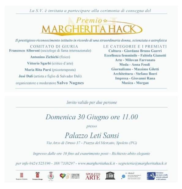 Onorata anche quest’anno di partecipare a Spoleto Arte. Raccogliendo l’invito di Salvo Nugnes, ho avuto occasione nella mattinata di domenica 30 giugno di assistere ad una sentita cerimonia di premiazione in memoria della “signora delle stelle” Margherita Hack. Il riconoscimento è stato da lui ideato e organizzato con l’intenzione di mantenere viva la memoria della grande donna che attraverso i suoi studi e le sue ricerche ha lasciato un patrimonio prezioso in simbolica eredità al mondo intero.