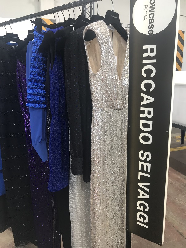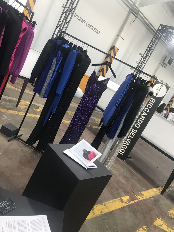 Girando per showcase, i miei occhi sono stati subito attratti dallo scintillio di paillettes, glitter, maglie effetto metallico e bellissimi abiti partywear e disco. Avvicinandoci, abbiamo trovato una collezione d’ispirazione anni ’80, con abiti caratterizzati da spalle rinforzate, della quale avrei indossato letteralmente ogni cosa. Era d’obbligo dunque conoscere il designer, che era lì presente. Riccardo Selvaggi è un giovane artista di origine napoletana che vive tra Milano e Napoli. Il suo showroom attualmente si trova solo a Napoli e la distribuzione si svolge solo in Campania, ma ci sono progetti di espansione. La sua infatti è una produzione giovane, nata lo scorso anno, con la collezione FW 2018. I suoi abiti sono made in Italy, realizzati tra Lombardia e Piemonte. La collezione che abbiamo visto ad Altaroma si chiama “Superba”: l’amor di sé, spinto all’eccesso. Ci racconta che la sua è una reinterpretazione della superbia, una “superbia 2.0”, nella quale la donna non sente il bisogno di disprezzare gli altri per affermare se stessa e non si cura del giudizio altrui. La visione dunque di una donna forte ed indipendente, in una collezione che unisce edonismo degli anni Ottanta e pragmatismo degli anni Novanta dando vita ad una interpretazione moderna. L’idea di Riccardo è che la donna oggi, grazie a passi avanti nell’emancipazione femminile, può permettersi di indossare ciò che vuole, facendo un gesto per se stessa e non per cercare di dimostrare qualcosa a qualcuno. Una visione del mondo forte e decisa ed una collezione originale ma allo stesso tempo indossabile rendono Riccardo Selvaggi un designer degno di nota, da tenere d’occhio.