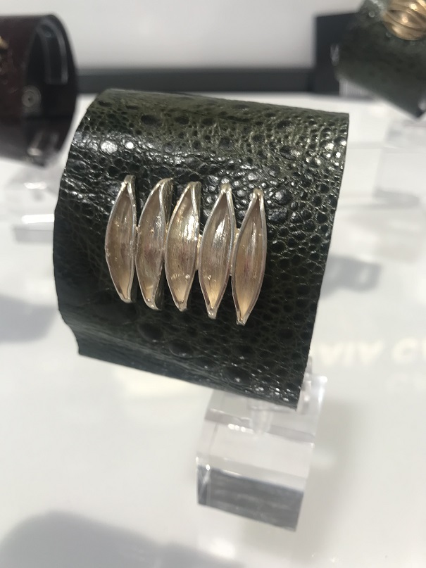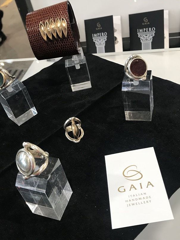 Primo giorno di Altaroma, appena entrate a Showcase, troviamo subito l’esposizione dei gioielli di Gaia Caramazza “GAIA Italian Handmade Jewellery”. Si comincia in grande. Gaia presenta ad Altaroma la sua collezione Impero: nel suo stile concettuale, ogni collezione è dedicata ad una tematica particolare e in questo caso la collezione è un tributo alla donna romana e ad un’epoca intramontabile, per ricchezza, progettualità e senso del bello. Proprio dalla ricerca della bellezza ha avuto origine questa collezione: “Cosa è bello per me? Per me è bella Roma, la mia città” mi dice Gaia. Mi racconta di aver ripreso manuali per studiare le tecniche tipiche dell’epoca romana, come la micro modellazione in cera e banchetto, nonché i tipici gioielli, da anelli vistosi che erano simbolo di un certo status, a bracciali alla schiava, a medaglioni. Tutto ciò viene reinterpretato e reso contemporaneo attraverso quello che è un tratto distintivo delle collezioni di Gaia, ovvero la reversibilità. Anelli, medaglioni e orecchini hanno tutti due “facce” che possono essere girate a piacimento, ad esempio da una parte troviamo la pelle e dall’altra bronzo e argento. Gli anelli in particolare sono unisex e ce ne sono alcuni più grandi, adatti a delle mani da uomo. Conosco già le collezioni di Gaia e ho notato che il filo conduttore è sempre la reversibilità o convertibilità delle sue creazioni: gioiello unico, usi molteplici. I bracciali della collezione Impero sono in pelle, in particolare sono state usate delle pelli “salvate” da un magazzino: hanno trovato così una nuova vita. E sopra ai bracciali troviamo diversi simboli che rimandano alla Roma antica come ad esempio il serpente in bronzo. Una collezione in generale molto elegante della quale ho apprezzato particolarmente gli anelli e gli orecchini reversibili