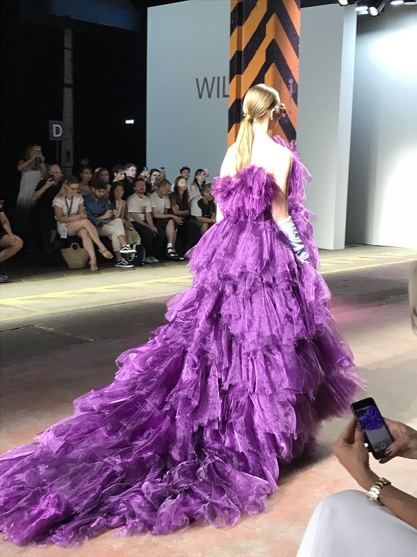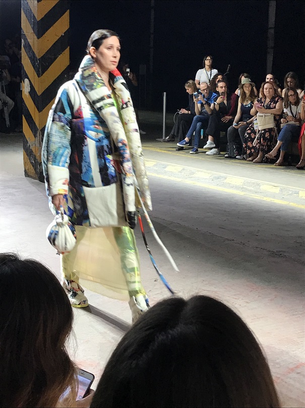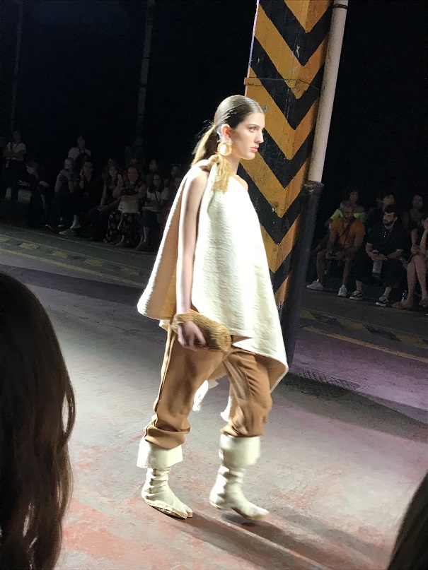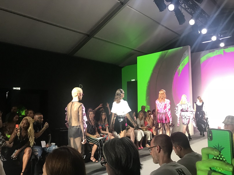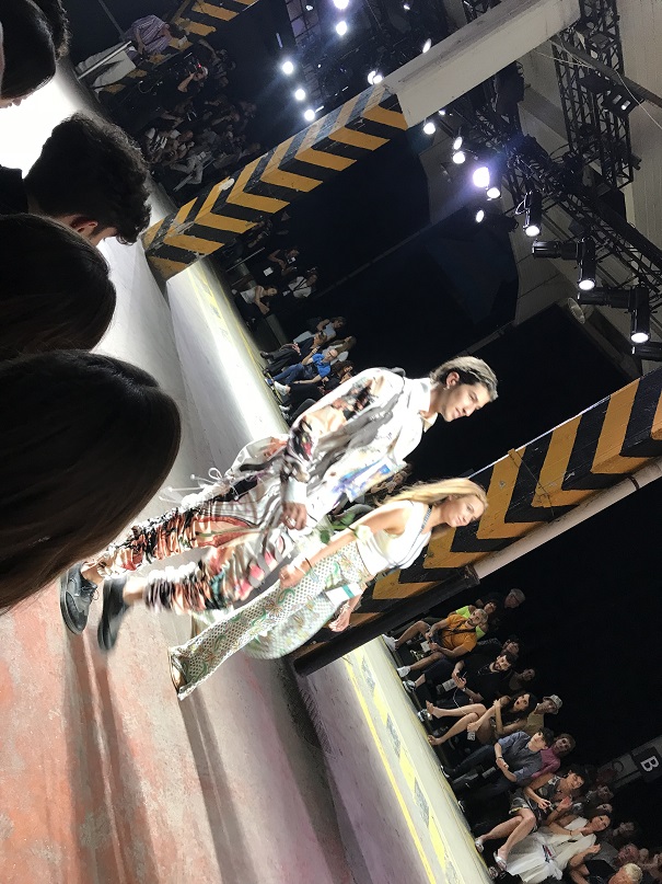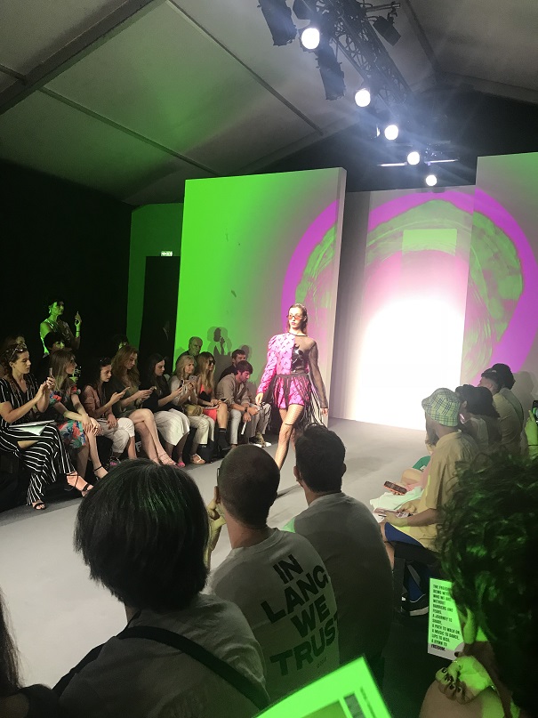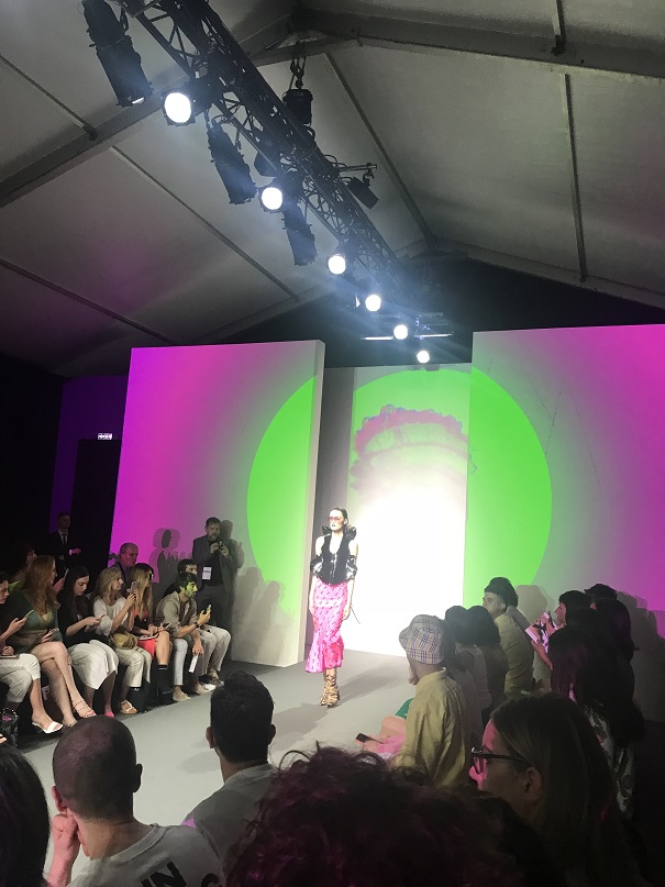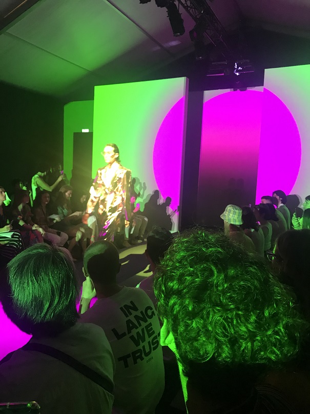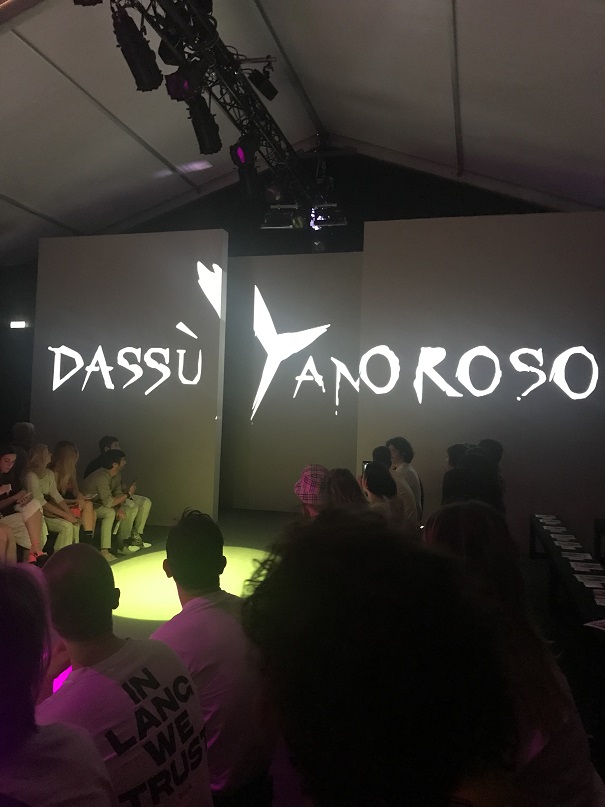 Alle h.11,30 la prima sfilata per noi è quella di DassùYAmoroso, un brand indipendente nato nel 2015 che si ispira allo Street-Punk contemporaneo, al mondo anglosassone e alle subculture giovanili. I due giovani creativi sono Stefano Dassù e Pasquale Amoroso, i quali attualmente insegnano alla Accademia del Lusso di Milano. Le loro collezioni puntano sull’individualità e su uno stile ribelle. La collezione SS 2020 si sviluppa attorno ai colori verde, viola e nero, variamente mixati in creazioni originali sia per uomo che per donna. Molto presente nella collezione anche il logo del brand (una Y realizzata come con una passata di pennello), stampato principalmente su t-shirt. Mi ha particolarmente colpito la musica che ha accompagnato la sfilata: un sound molto duro, ma sicuramente in linea con lo stile del brand. In particolare il brano proposto era del gruppo musicale islandese Hatari, nato anch’esso nel 2015, e che si caratterizza per i generi musicali techno e punk. A contrastare il sound “hard”, il video di apertura della sfilata, sebbene anch’esso rimandasse ad un contesto rigido, militare, trasmetteva messaggi di amore, rispetto, speranza, uguaglianza. Dunque potremmo definirla una sfilata basata sui contrasti, ma contrasti sicuramente ben orchestrati e riusciti.
