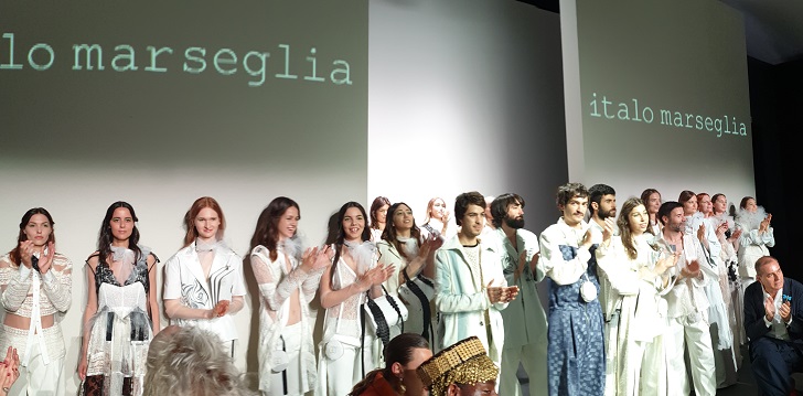 Il racconto di un viaggio tra veglia e sogno, dove i confini del reale e dell’immaginazione sono destinati a fondersi insieme. Contaminazioni, materiali inediti come la pelle di salmone realizzata in partnership con l’azienda islandese Atlantic Leather, leader mondiale nella concia di pellami di recupero provenienti dall’industria ittica alimentare, pizzi d’archivio messi a disposizione dalla storica maison francese Sophie Hallette e vecchi campioni donati dal ricamificio Lusi e denim degli anni ’70, recuperato dai magazzini dell’azienda capitolina Fratelli Bassetti Tessuti. Obiettivo: restituire ai tessuti nuova vita e nuovo valore per reinventare una grammatica della contemporaneità attraverso la funzionalità delle forme, il valore dei tessuti, la ricercatezza del lavoro sartoriale. Il bianco è il colore dominante della collezione, che gioca con tutti i fondamentali del vestire: dalla camicia allo chemisier portato con lo smoking. La donna di Marseglia è una viaggiatrice colta e sofisticata che ama lingerie e camicie da notte vittoriane, veli di tulle come ricordi evanescenti e sogni sbiaditi ma anche tocchi dark e fetish come simboli delle sue contraddizioni.