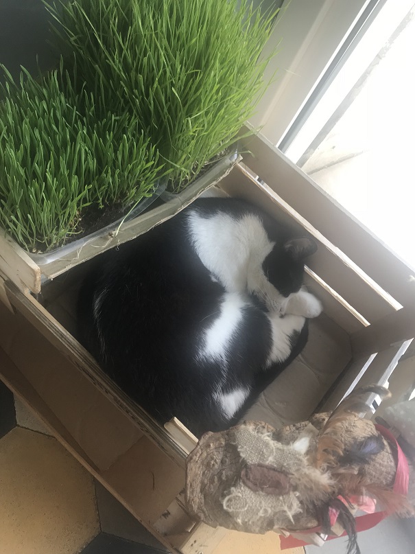 mio marito con uno dei gatti del locale