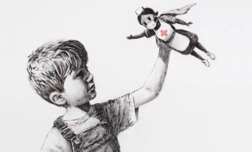 Un bimbo gioca con una bambola / infermiera con il grembiule della Croce Rossa, la mascherina sul volto ed un mantello e lascia nel cesto supereroi come Batman o l’Uomo Ragno… così Banksy omaggia le infermiere ai tempi del coronavirus!