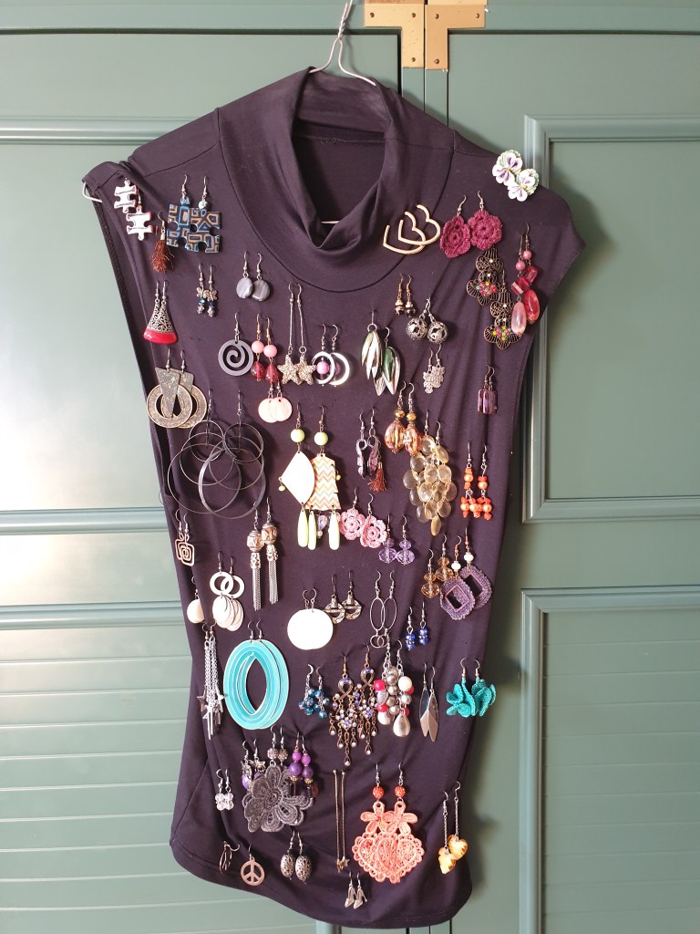 In che senso “la maglietta degli orecchini”? Negli anni ho collezionato, insieme a mia madre, una quantità spropositata di orecchini. Quelli di valore li conservo in altro modo, ma per quelli di bigiotteria abbiamo trovato una soluzione semplice ed efficace. Abbiamo preso una maglietta vecchia che non si utilizzava più e ci abbiamo attaccato tutti gli orecchini di bigiotteria. La maglietta si appende dove vogliamo, gli orecchini non si rovinano e non si rischia nemmeno di dimenticarseli chiusi in qualche scatola. Su internet si trovano anche delle magliette organizzatrici di accessori, costruite appositamente per questo scopo. Ma perché comprarla, quando si può realizzare in autonomia? Ecco la nostra!