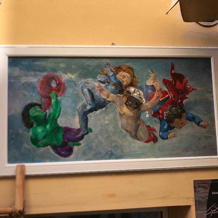 Con l’occasione ho potuto salutare l’artista Cristoforo Russo, uno degli artisti che si erano resi disponibili durante il lock down per il progetto “L’arte non si arrende” promosso da questo blog, e ho potuto ammirare le sue particolari opere tra spiritualità ed irriverenza. (#cristoforarte)