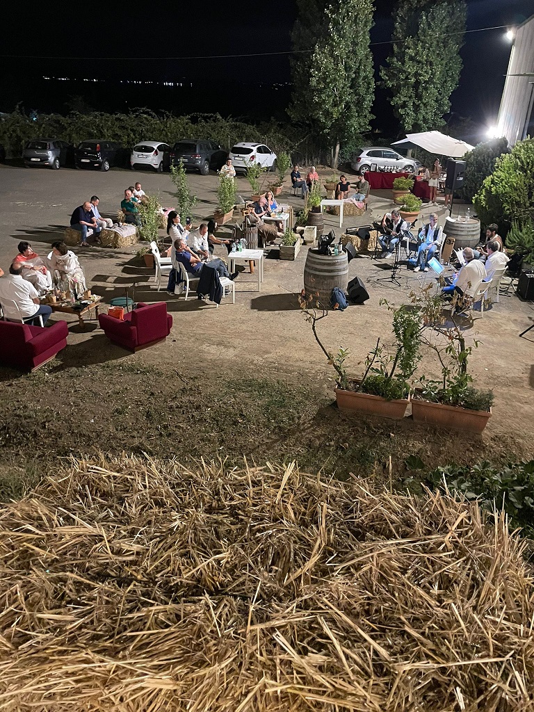 Uno scenario da film. Di quelli belli con l’aria nostalgica. Ambientata in una vigna in Borgogna o in un’altra qualsiasi regione della Francia produttrice di vini. Luci tra i grappoli ancora acerbi, balle di fieno che fanno da seduta e tavoli improvvisati da antiche botti. Mettici poi una serata estiva, le cicale ed una musica di sottofondo. Eppure tutto ciò è stata realtà ieri sera presso Le Cantine Capitani a Trevignano dove si sono riuniti una sessantina di ospiti nel rispetto del distanziamento e delle normative anticovid in vigore.