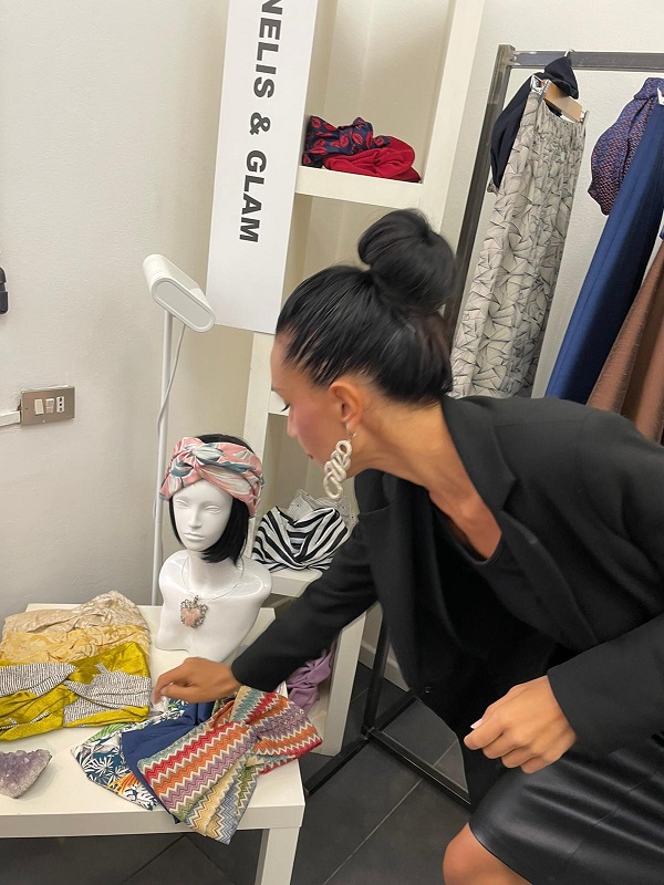 Nelis & Glam è un brand ideato nel 2018 da Elisa Negro. Elisa nasce come Image Coach e Consulente di Stile. Mi racconta che si è formata in Armocromia con Rossella Migliaccio quando ancora l’Armocromia non era così diffusa. Questa particolarità mi incuriosisce subito. Elisa mi mostra così la sua collezione di fasce e turbanti, alcuni più rigidi, altri meno: questo è utile per dare più o meno risalto alla verticalità del volto, in base alle caratteristiche specifiche di chi li indossa. I turbanti e le fasce della sua collezione incontrano ogni tipo di gusto e di stagione cromatica: dai più semplici con una sola nuance, a quelli più creativi con motivi geometrici e più colori, nonché diversi tessuti (in seta, in maglia…) e diverse modalità per poterli fissare al capo (circolari, con fiocchi/nodi davanti o dietro…).