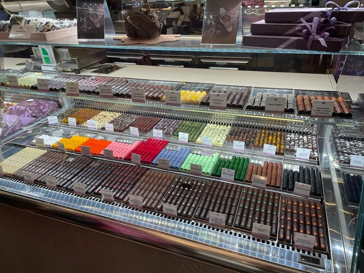Abbiamo scelto due selezioni di praline di cioccolato e due monoporzioni. Le praline vanno dai gusti più semplici (senza ripieno, solo diversi tipi di cioccolato) a gusti con ripieni più “classici” come lampone, nocciola, caffè, fragola; ad altre tipologie con ripieni stravaganti come pomodoro e basilico, speck e pepe nero, capperi e limone. Abbiamo scelto una selezione che comprendesse un po’ tutte le categorie, anche le più particolari.