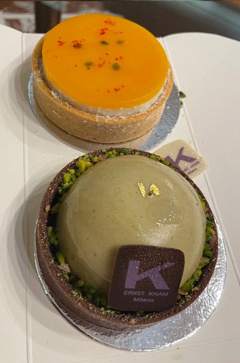 Le monoporzioni, invece, erano una con base di frolla al cacao, cioccolato, mousse di pistacchio e inserto di lime. L’altra anch’essa con base di frolla, un cremoso al mango ed un gelée al frutto della passione.