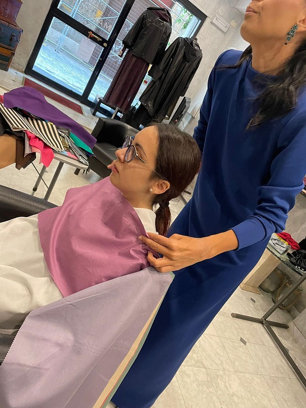 Come prima cosa, Elisa ha fatto un’introduzione generale sull’Armocromia. Dopodiché mi ha fatto legare i capelli ed ho indossato un telo bianco a coprire la mia maglietta. Elisa mi ha posto alcune domande, con particolare riferimento alla mia modalità di abbronzatura e ai colori di capelli, occhi e pelle dei miei genitori. I primi elementi analizzati sono stati sottotono e contrasto. Il sottotono si individua accostando al viso teli di diverso colore, alcuni più intensi, altri meno. Poiché i colori più intensi mi illuminavano il volto, ne abbiamo dedotto che ho un sottotono freddo. Un altro test per il sottotono eseguito da Elisa è quello del metallo, provando teli gold e silver accanto al viso. L’oro mi ingrigisce, mentre l’argento mi illumina, confermando così il sottotono freddo.