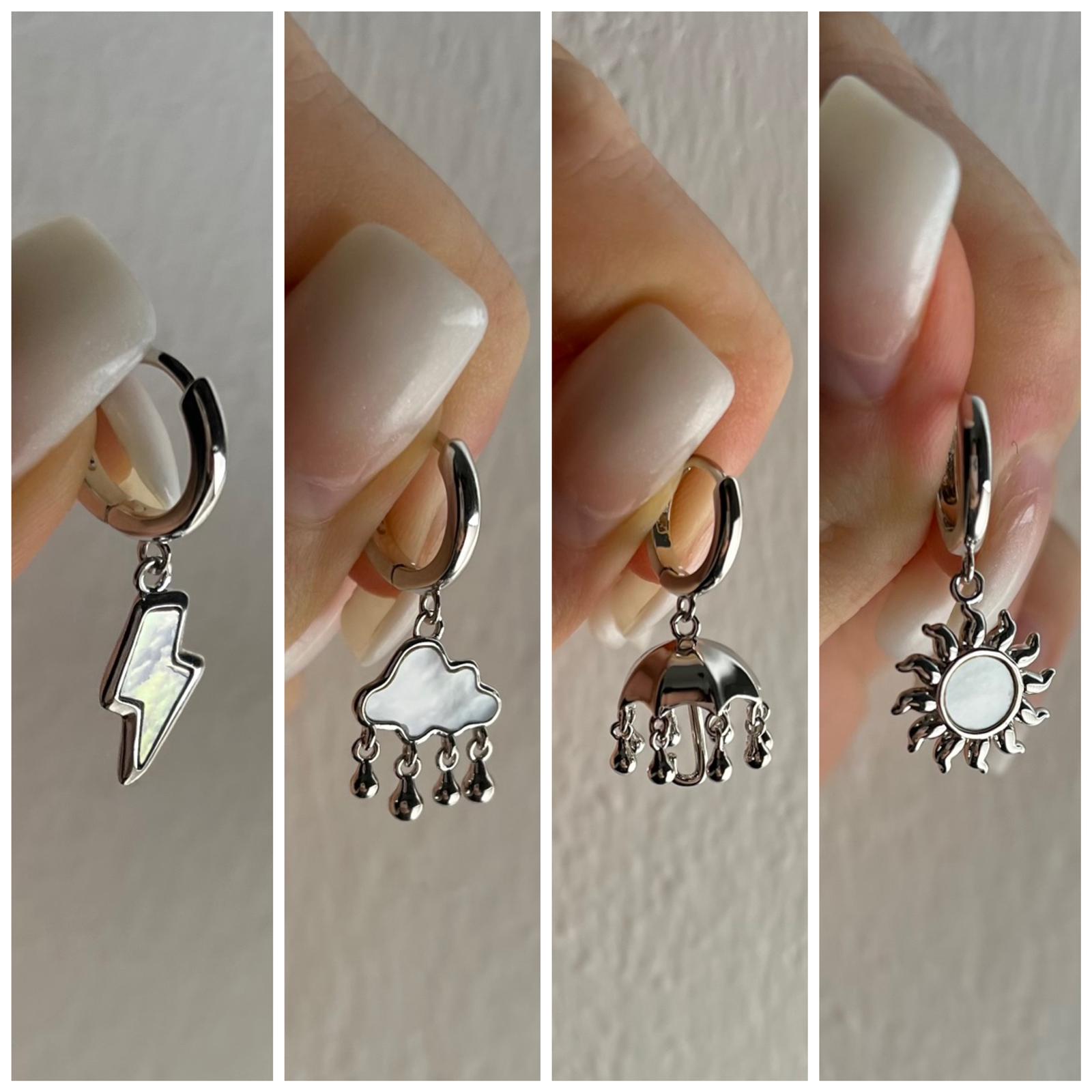 I quattro orecchini sono hoop (ovvero piccoli cerchi) con pendenti a forma di fulmine, nuvola con la pioggia, ombrello e sole.