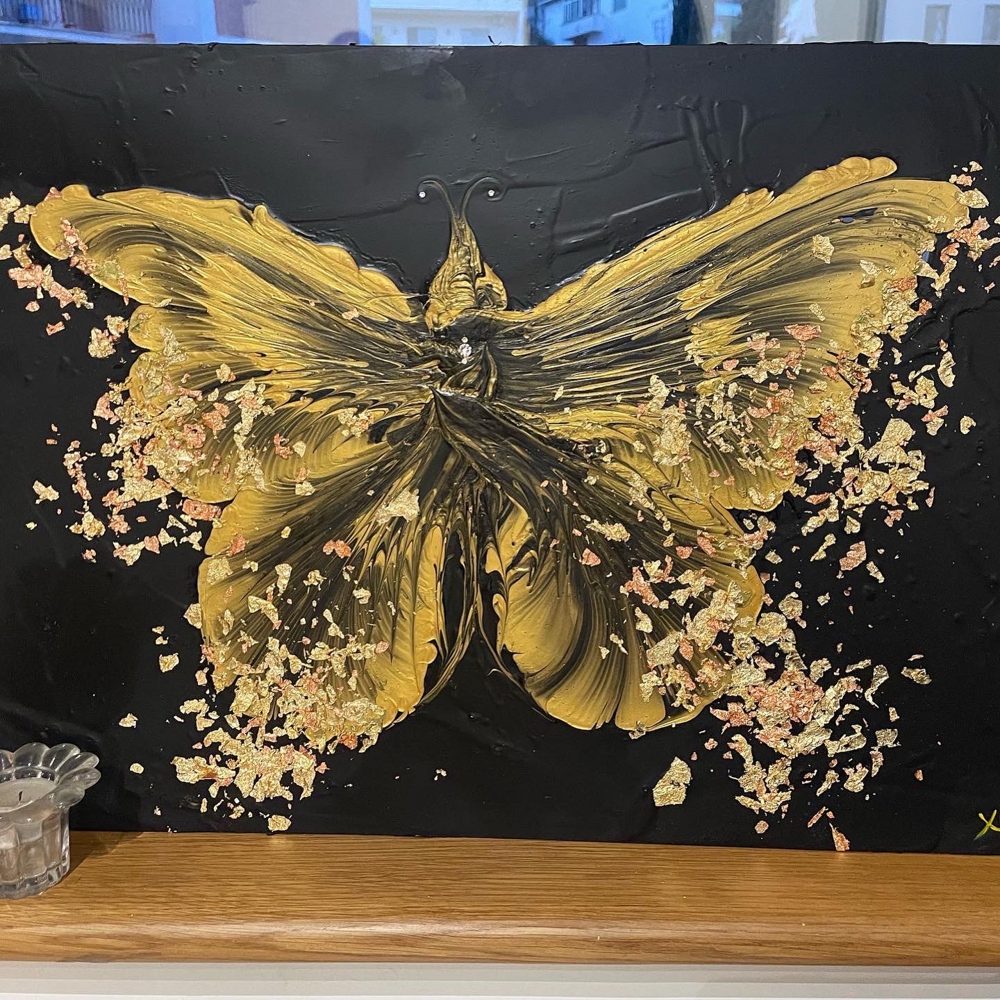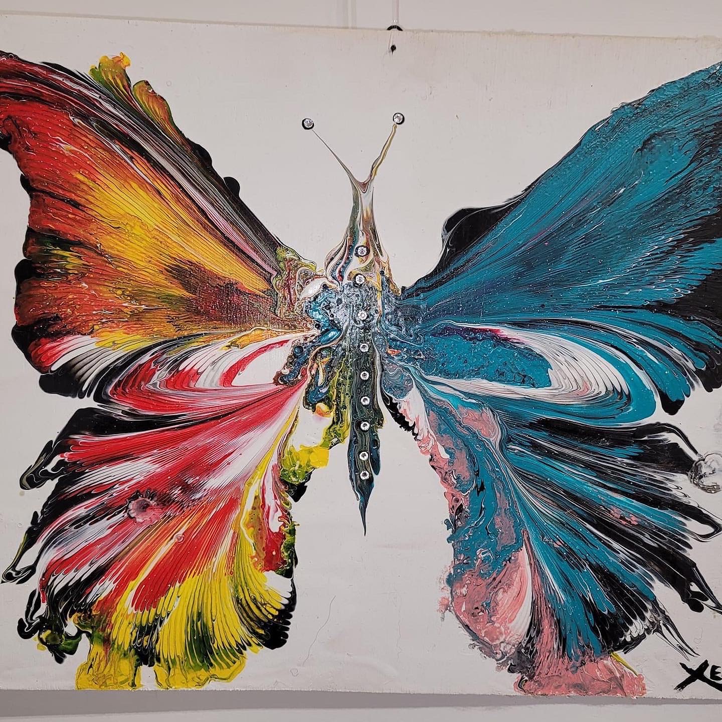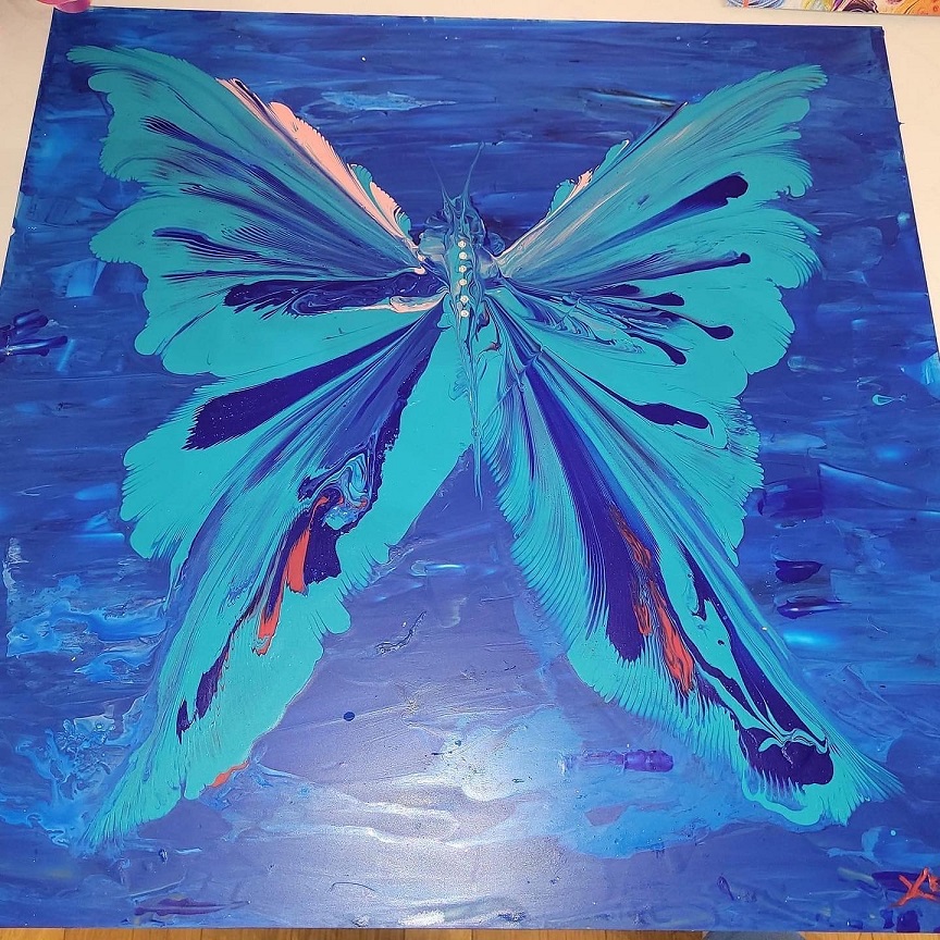 Con la sua tecnica di Arte Fluida crea fiori e farfalle utilizzando tele e supporti creati appositamente così come molti degli strumenti che utilizza per ottenere effetti cromatici davvero articolari.
