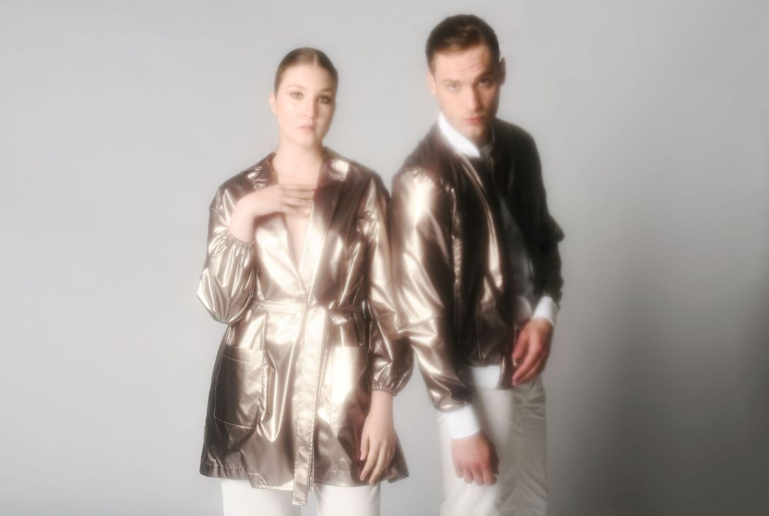 Dualismo “interrotto” dal colore bronzo che, oltre a essere utilizzato per alcuni capi, è presente anche sugli sguardi delle stampe che riproducono il volto di un uomo e di una donna. Sguardi che intravedono un nuovo inizio, ma offuscato, annebbiato, quasi incerto e allo stesso tempo ricco di sorprese, essendo il bronzo anche il colore delle lampade magiche.