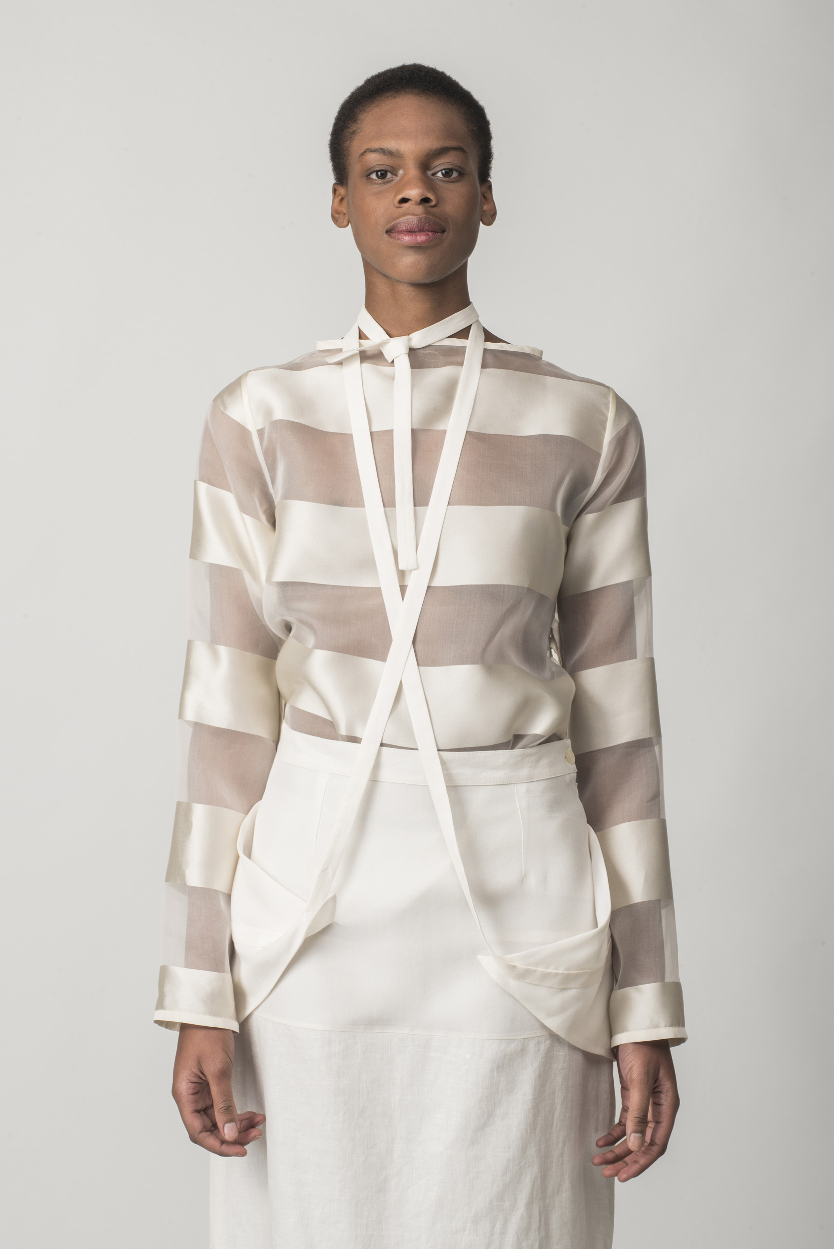 È una collezione dalle linee rigorose e quasi maschili che omaggiano lo stile inconfondibile dello scrittore, adattato però al corpo femminile attraverso l’uso sapiente dei tessuti che quasi si appoggiano al corpo. Ad esempio il completo camicia-pantaloni bianchi in seta burette decorati dalla catena dell’orologio dello scrittore evoca lo stile Anni Trenta che ritroviamo in molti suoi scatti d’epoca. O la gonna-tasca che sembra nascere direttamente da una sua giacca.