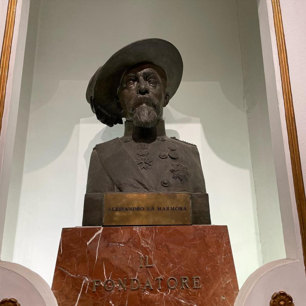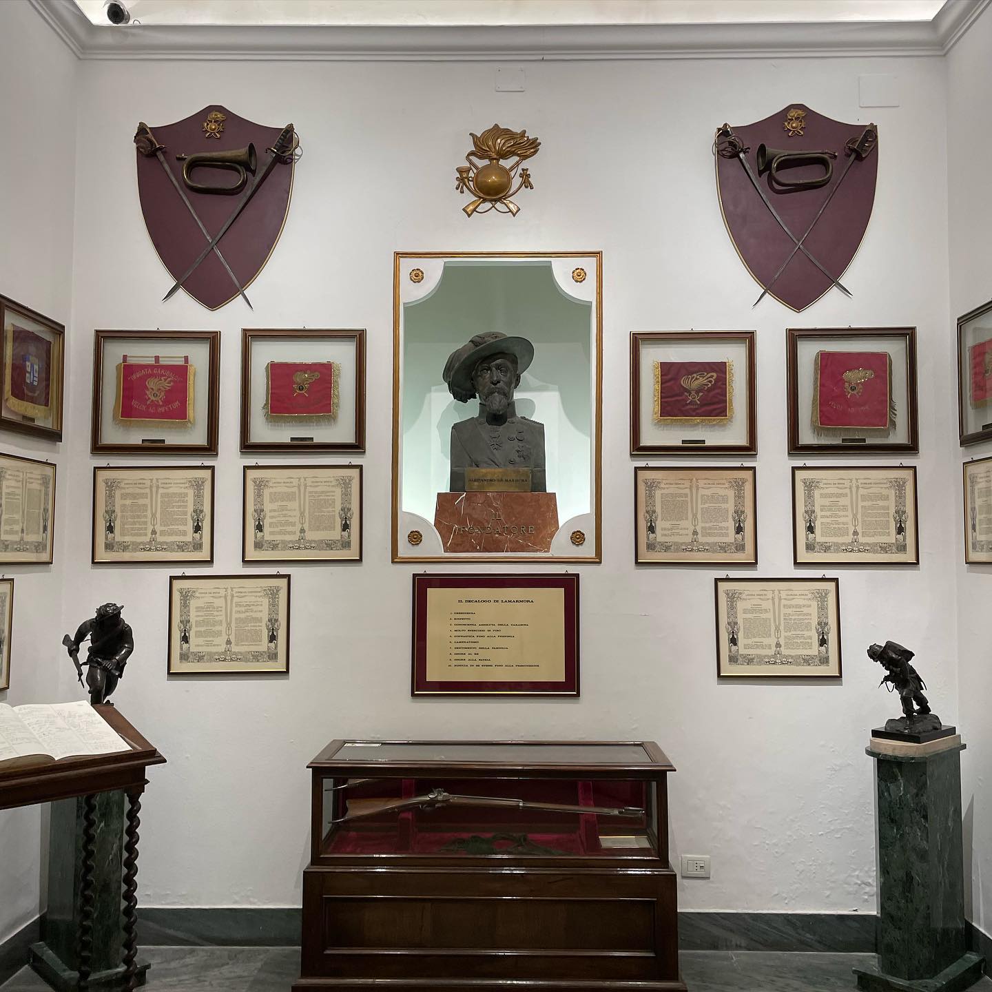“Passando sotto il grande arco della Porta esterna del Vespignani si entra nel cortile interno del Museo ove sono collocati i busti in bronzo dei più illustri rappresentanti del Corpo, unitamente al monumento ad Enrico Toti, il più romano tra i bersaglieri, volontario per vocazione. Dal lato nord del cortile si accede ai locali interni in cui sono esposti i cimeli ed i ricordi relativi alla istituzione e all’evoluzione del Corpo, seguendo il filo logico delle vicende alle quali parteciparono reparti di bersaglieri. Al piano terreno sono ubicati: la saletta La Marmora, il Salone d’Onore ed il Sacrario. Nella saletta La Marmora, sotto il busto del Fondatore, sono esposte due carabine, con fiaschetta per polvere a misurazione automatica per il rapido caricamento, da lui ideate prima del 1836; uno dei due modelli fu adottato nel 1839 quale armamento base per i primi reparti di bersaglieri. Nel Salone d’Onore tra i diversi preziosi cimeli c’è la Proposizione originale, uno scritto di pugno da La Marmora per ottenere dal re Carlo Alberto la costituzione del Corpo, documento che è alla radice di tutta la sua successiva e gloriosa vicenda. Il pianterreno si conclude con il Sacrario dedicato agli oltre centomila Caduti per la Patria; la Sala, al cui centro è esposta la sciabola che La Marmora impugnò l’8 aprile 1848 a Goito, ha nella parete di fronte un ritratto ad olio del Fondatore affiancato da due grandi teche contenenti le medaglie al valore collettivo assegnate ai reparti bersaglieri dal 1848 ad oggi.