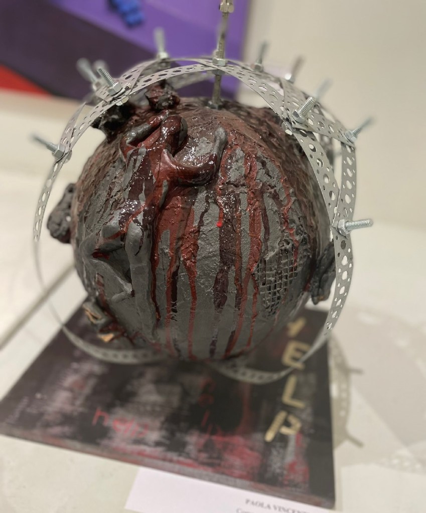 Una terra “meccanica”, ma anche incerottata. Una terra che chiede aiuto, malgrado la sua natura sempre più tecnologica che non basta ad arginare il problema, la preoccupazione e la paura. Una terra che ne esce “rotta” sfiancata e triste. Con l’arte le diamo nobiltà. Diamo nobiltà anche alla paura e senza dubbio è un segnale di speranza. Paola Vincenti, che ormai seguo da tanto tempo, è sempre stata eclettica, creativa. Per lei l’emozione diventa ispirazione. Dialoga con il pubblico attraverso il segno e quel segno coglie appunto la mutevolezza e la precarietà del nostro tempo come in Help.