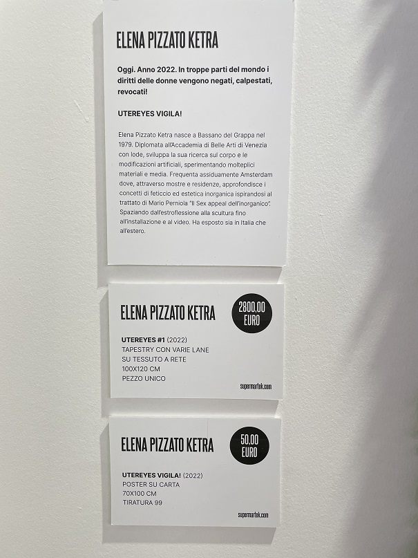 Opere di denuncia come quelle di Elena Pizzato Ketra in cui l’artista grida: “Oggi. Anno 2022. In troppe parti del mondo i diritti delle donne vengono negati, calpestati, revocati “rappresentando grandi organi femminili muniti di occhio “Utereyes Vigila!”
