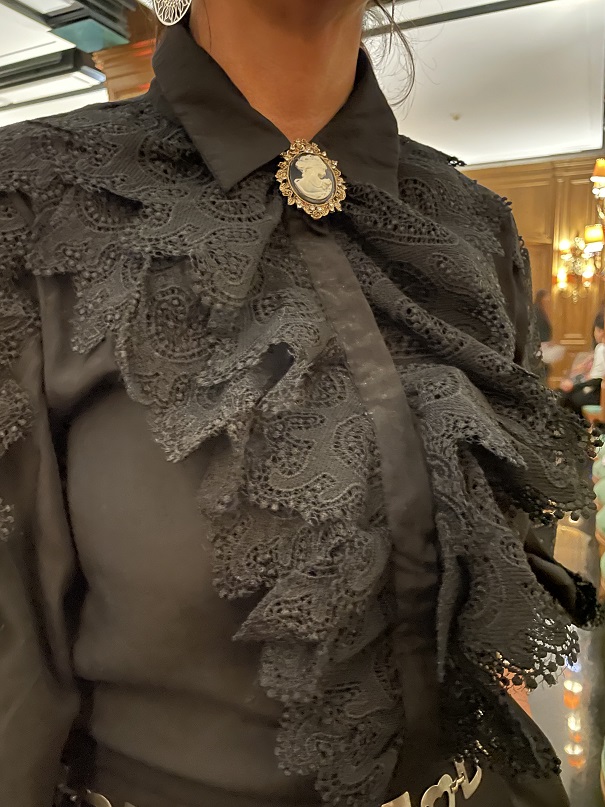 Il mio look da sfilata è stato ispirato a Mercoledì Addams che sta spopolando in rete per cui quando ho visto questa meravigliosa camicia non poteva essere che mia ed il cameo nero le dona quel tocco gotico interessante non trovate?
