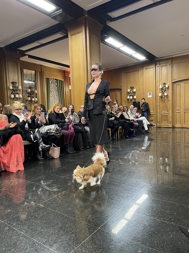 Ho incontrato Gian Paolo un’ora prima della sfilata. Era tranquillo, mi ha illustrato la location davvero strepitosa: il Circolo degli Ufficiali dell’Esercito Pio IX in Viale Castro Pretorio a Roma, e raccontato alcuni aneddoti del dietro “le quinte” tra cui il permesso speciale ricevuto per Sansone, il suo amato cagnolino, che poi abbiamo visto sfilare in passerella rigorosamente al guinzaglio di una elegantissima modella.