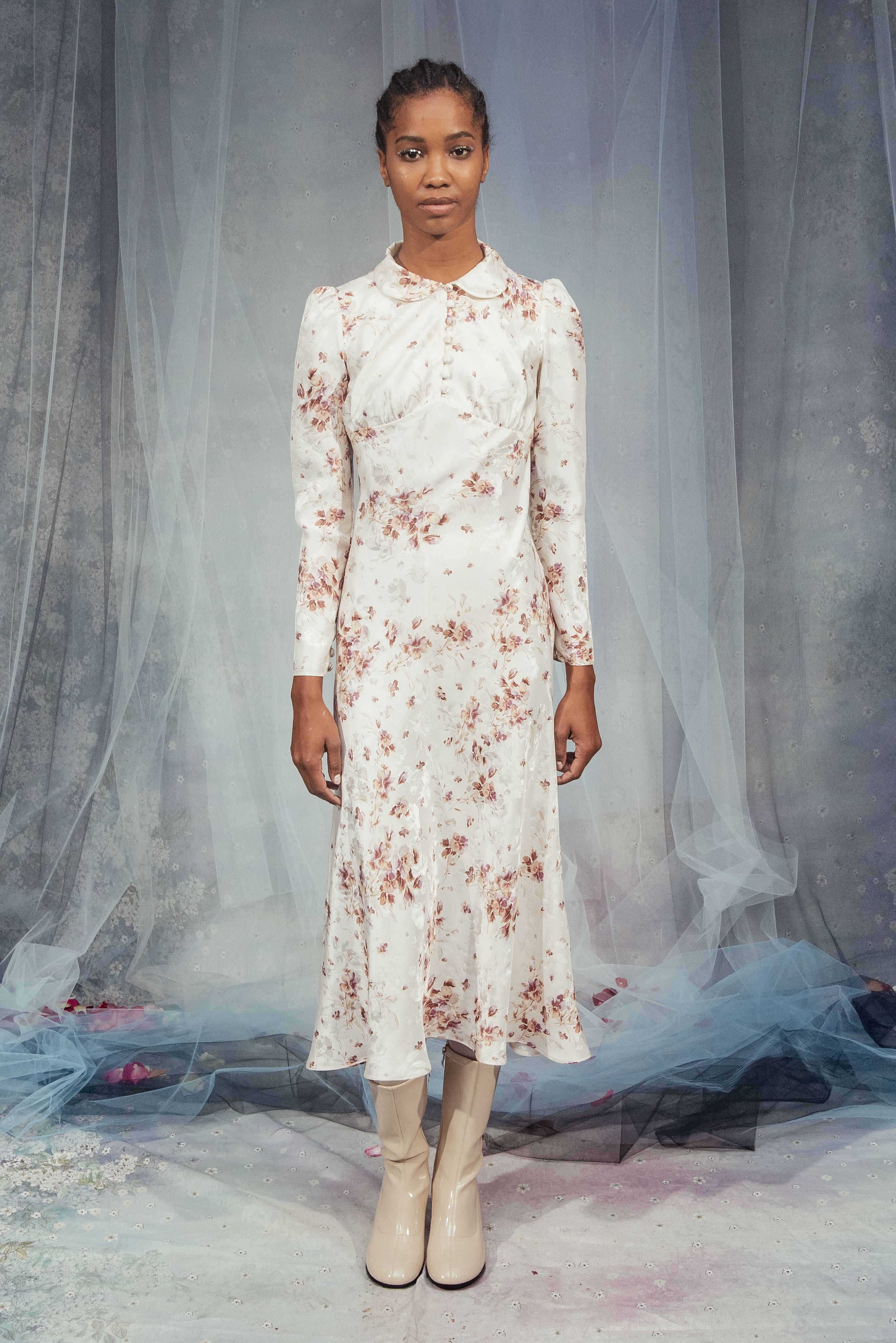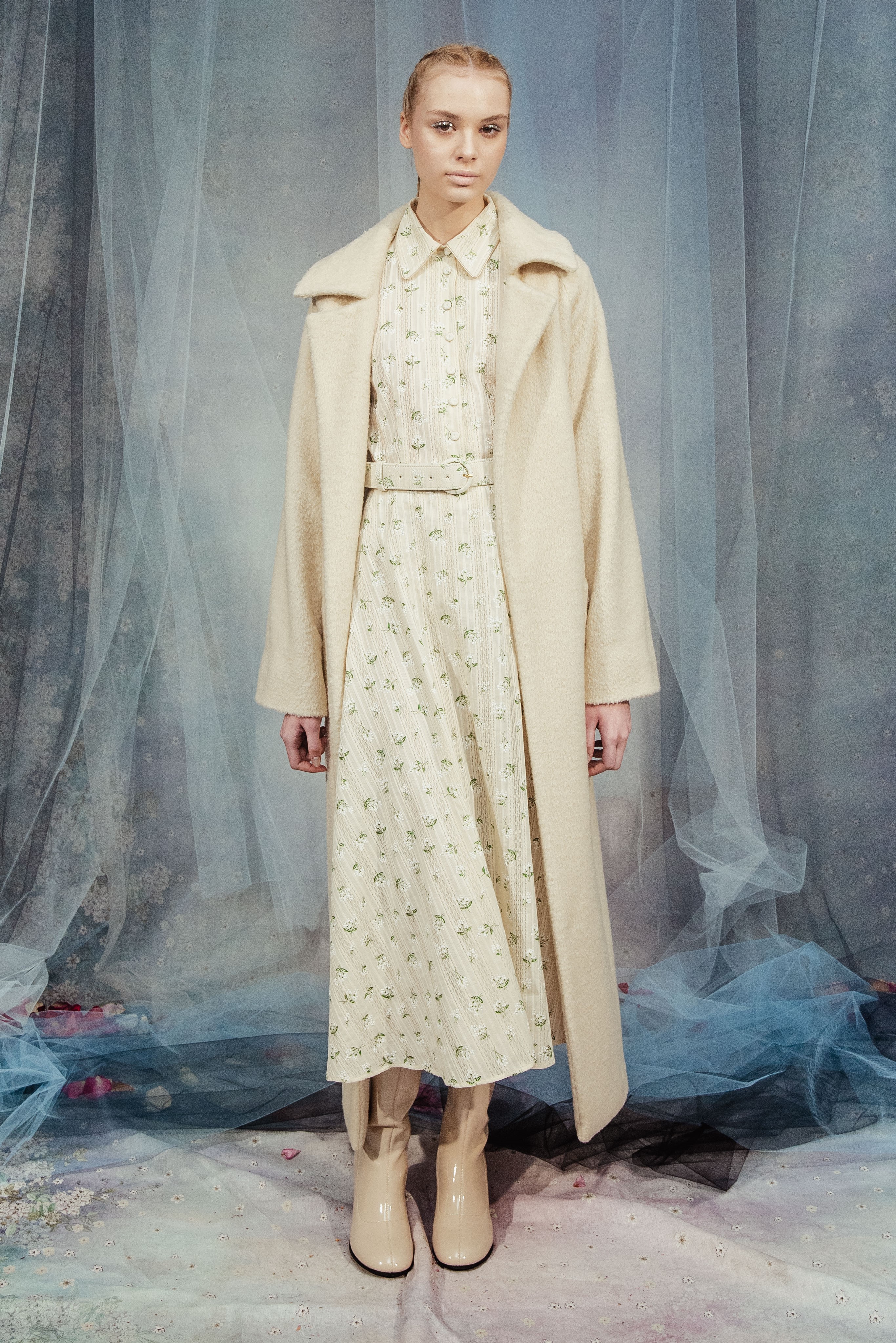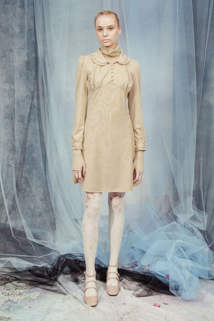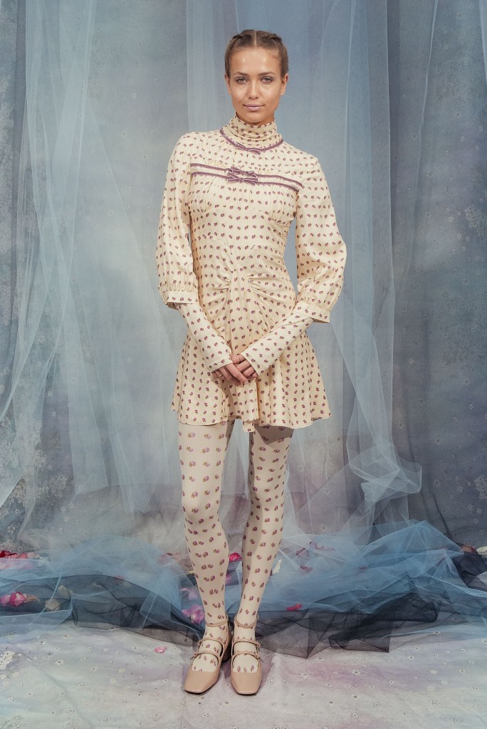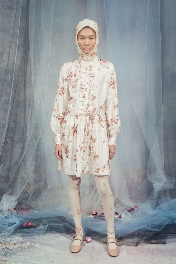 Catene e piogge di boccioli impreziosiscono abiti a balze in lana stretch abbinati a passamontagna, per il giorno. Il pantalone rosso intenso dalle linee morbide si completa con redingote over dalle spalle scese stretta in vita con alte cinture ton sur ton. La stessa si tramuta in mini dress in morbidissimo camoscio carta da zucchero. Lo chemisier tempestato di roselline si porta sul lupetto stampato, mentre la blusa monocroma in jersey diventa couture con nervature e filettature sartoriali.