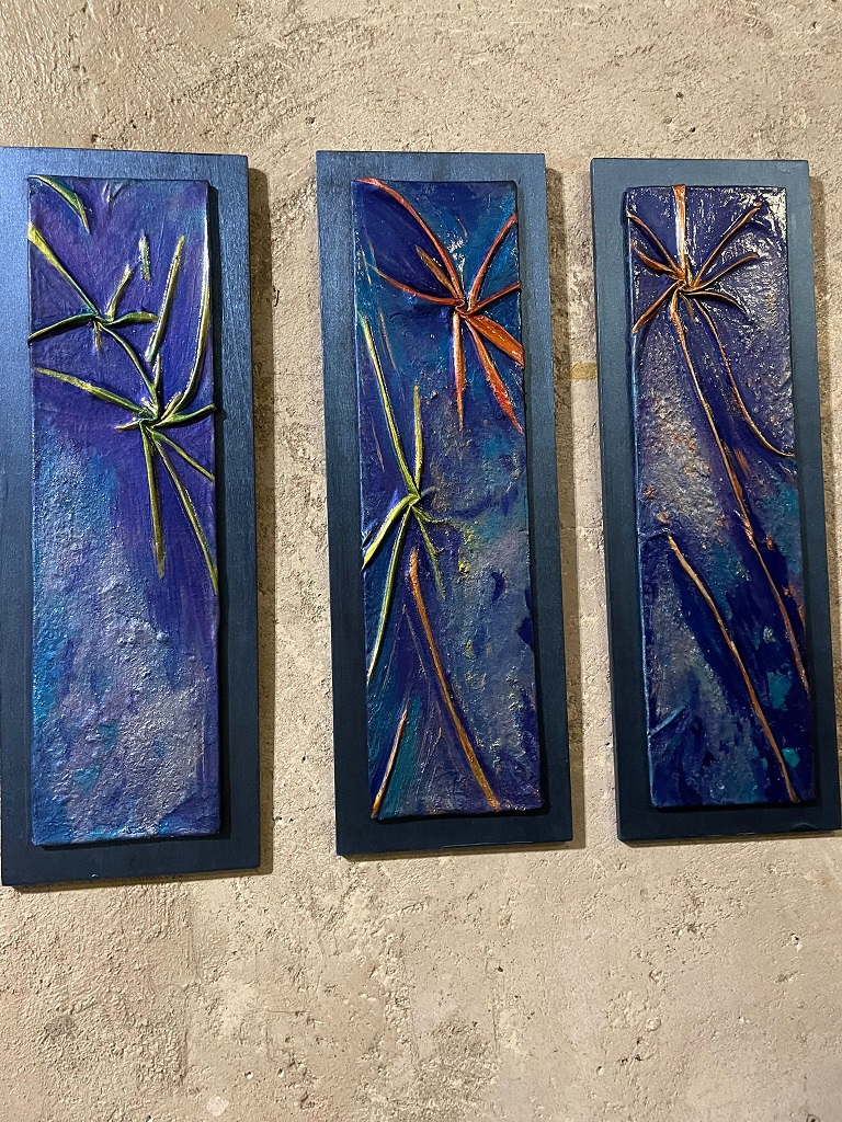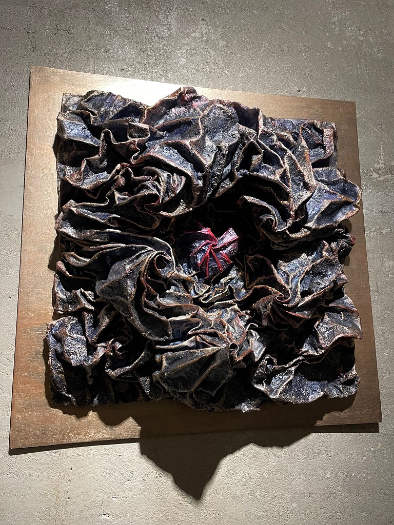 Entrando in questa galleria sui generis capiamo subito cosa intendesse Anna D’Elia con la definizione “Il Caos genera stelle” in effetti da quella sostanza melmosa e scura emergono forme elicoidali di sicuro impatto. Un impatto visivo, ma anche emozionale. I nostri dubbi, paure, ma anche aspirazioni possono rimanere lì per un’intera vita, senza però permetterci di vivere davvero a pieno la nostra esistenza. Possiamo però avere il coraggio, dopo un periodo di caos, di affrontare quei limiti, quelle paure e permetterci di esprimerci al meglio della nostra essenza. E’ lì che l’artista può fermare in una tela tutte quelle emozioni e creare stelle e a tutti noi nel nostro piccolo di vivere una vita “senza se e senza ma”.