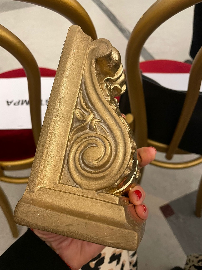 I premiati hanno portato a casa una porzione di capitello dorato “la preziosa scultura” realizzata dalla creatrice di gioielli Marina Corazziari, Presidente di Spazio Art d’ Or ed ideatrice del Premio.