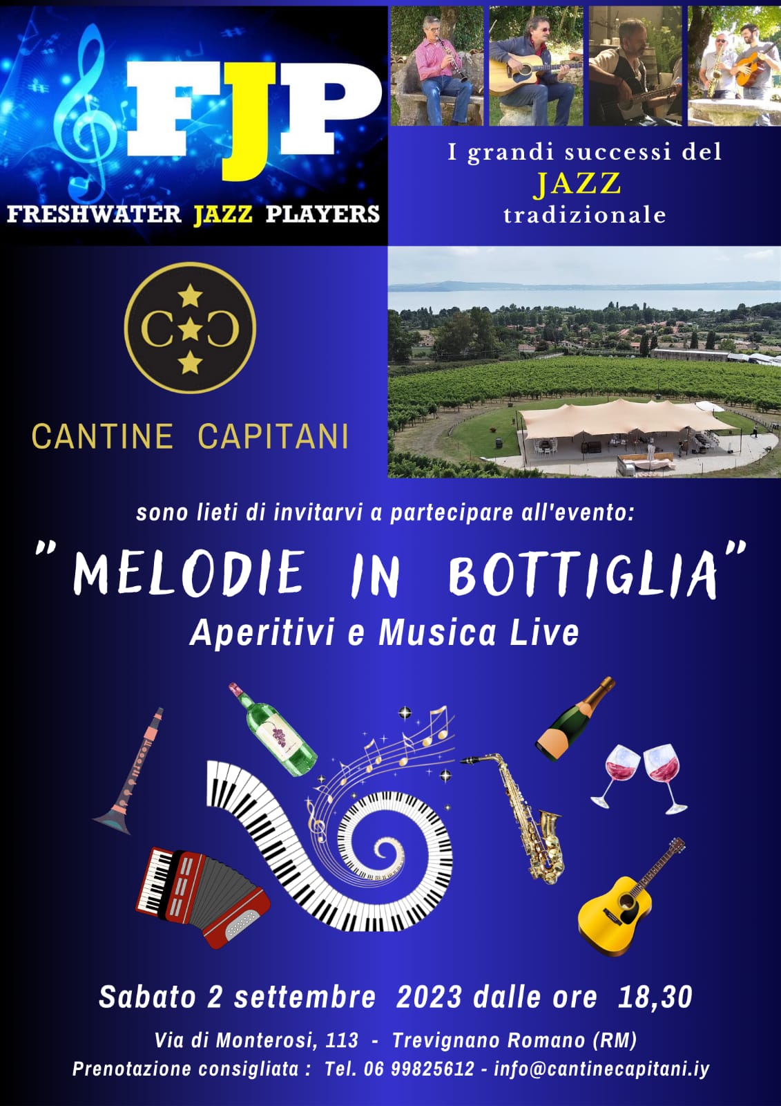 Saranno i Freshwater Jazz players ad allietare con musica senza tempo una serata in vigna ospiti delle Cantine Capitani a Trevignano romano sabato 2 settembre p.v. in via di Monterosi 113.