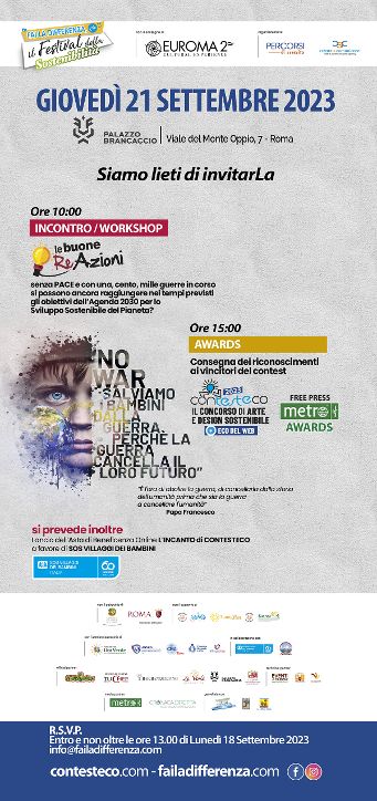 Dopo mesi di lavori instancabili e decine di appuntamenti sul territorio della capitale si concluderà giovedì 21 settembre “FAI LA DIFFERENZA, C’E’… IL FESTIVAL DELLA SOSTENIBILITA’” Sarà lo storico Palazzo Brancaccio ad ospitare l’evento di chiusura che si preannuncia ricco di sorprese!