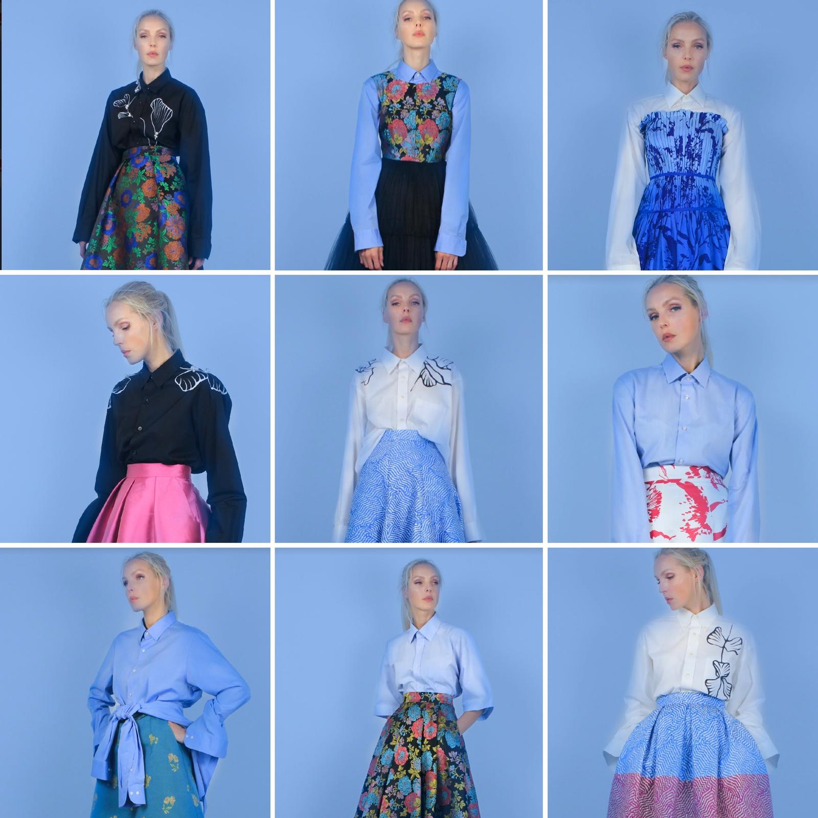Un raffinato equilibrio degli opposti, dove la camicia tradizionalmente maschile incontra i volumi di gonne romantiche in armonia tra loro. Ogni singolo dettaglio diventa un elemento distintivo con ricami e disegni floreali hand-painted, mescolando l’immaginario affettivo del designer con la tecnica sartoriale di stampo tipicamente italiano.