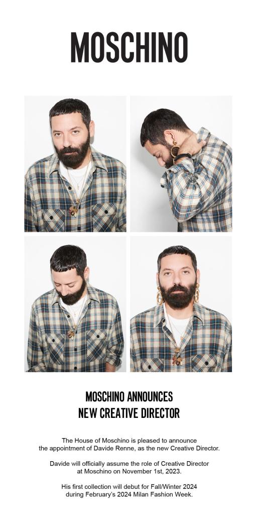 Orfani dopo l’addio di Jeremy Scott a marzo di quest’anno, e dopo che durante la fashion week milanese abbiamo visto sfilare per la Primavera/Estate 2024 l’interpretazione di 4 stylist, finalmente l’atteso annuncio: dal primo novembre assumerà la Direzione Artistica del marchio fondato da Franco Moschino Davide Renne.
