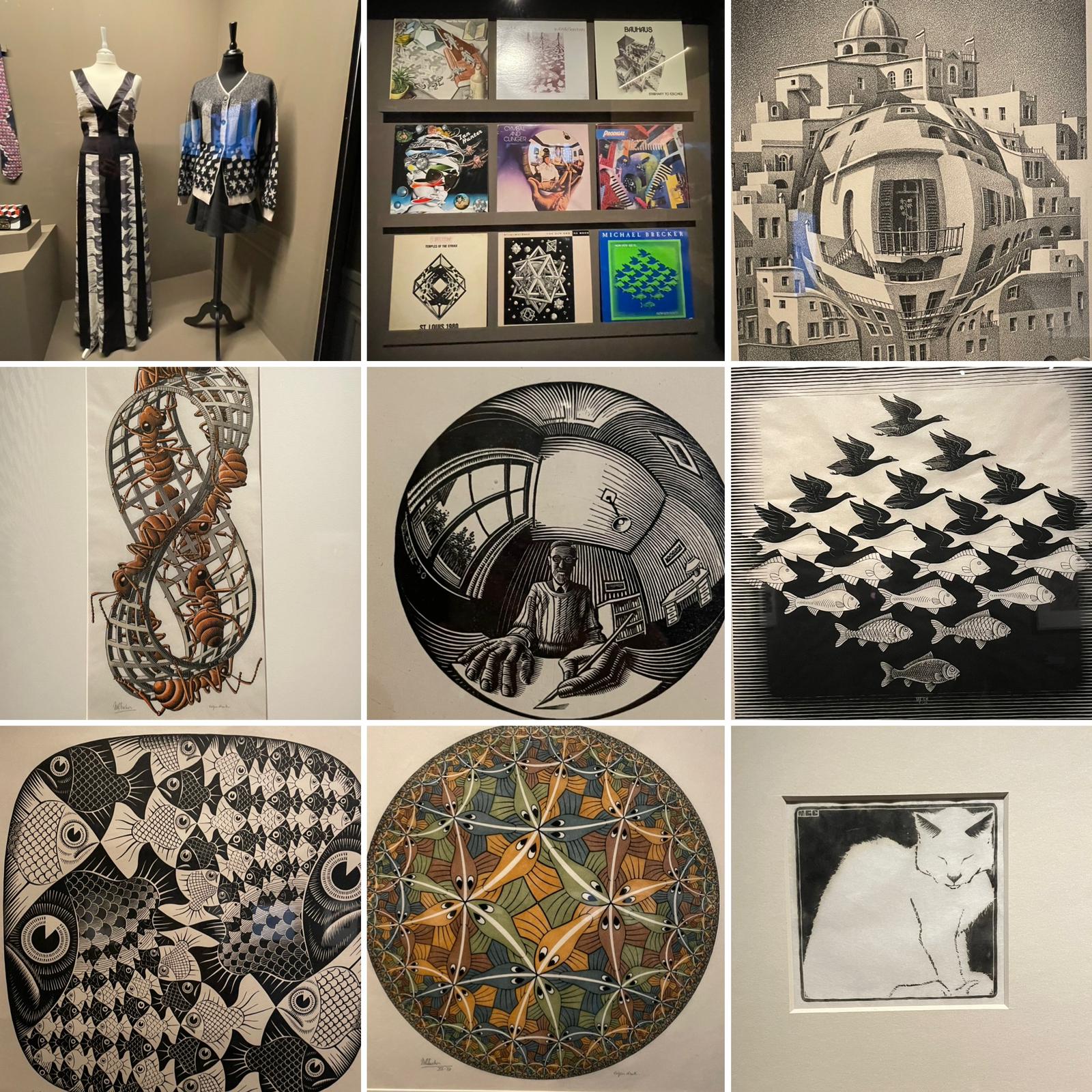 Le influenze dell’Art Nouveau sono presenti nella prima sezione della mostra in cui flora e fauna prendono forme grafiche. Segue uno spazio dedicato all’Italia. Qui si sposò e formò una famiglia. Probabilmente gli anni più felici dell’autore. La città eterna ha ispirato moltissime delle sue opere, ma anche i suoi viaggi in Campania, Calabria, Sicilia, Abruzzo che tramutò in opere di paesaggi. La terza sezione si chiama Tassellature e con questo termine si indicano i modi di suddividere il piano con una o più figure geometriche che vengono ripetute all’infinito senza sovrapposizioni e senza lasciare spazi vuoti. L’influenza della tassellatura ispirerà le sue opere geometrico-matematiche, paradossali o illusorie. Le tassellature sono alla base dei cicli e delle metamorfosi, il tema della quarta sezione. La xilografia Metamorfosi II è uno dei suoi capolavori dove in un universo circolare una lucertola può diventare un alveare o un pesce per tramutarsi in uccello….Nella quinta sezione si sottolinea la struttura dello spazio infatti l’autore dimostra nelle sue opere un’attenzione particolare per l’organizzazione dello spazio. I paradossi geometrici sono i protagonisti della sesta sezione. Le composizioni geometriche si caratterizzano, grazie a distorsioni prospettiche, come perfettamente plausibili, ma si rivelano impossibili ad una più attenta ispezione come nelle opere Salire e Scendere, Cascata, Relatività. La settima sezione è dedicata ai lavori su commissione in cui ritroviamo una carrellata di articoli pubblicitari, design per loghi e persino biglietti d’auguri. Si conclude la mostra con una vera e propria Eschermania. Negli anni “60 il movimento hippy riprodusse su magliette e poster molte sue opere e le sue opere influenzeranno altri artisti, fumettisti, pubblicitari. Nella mostra anche una teca contenente alcuni abiti e scarpe create utilizzando le sue basi grafiche negli ad opera di varie case di moda.