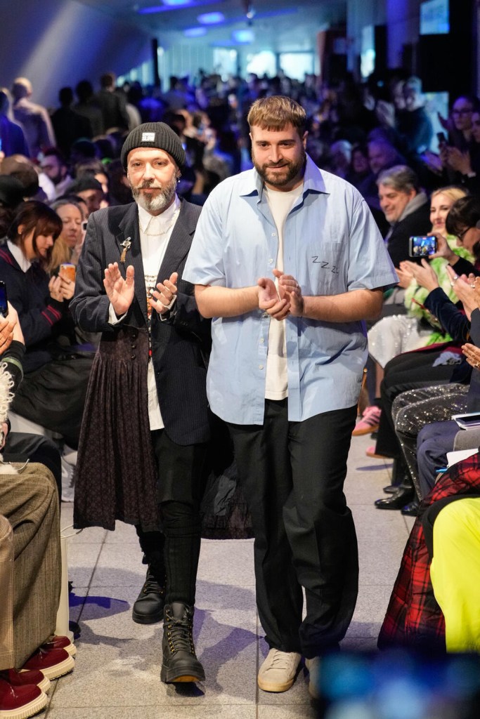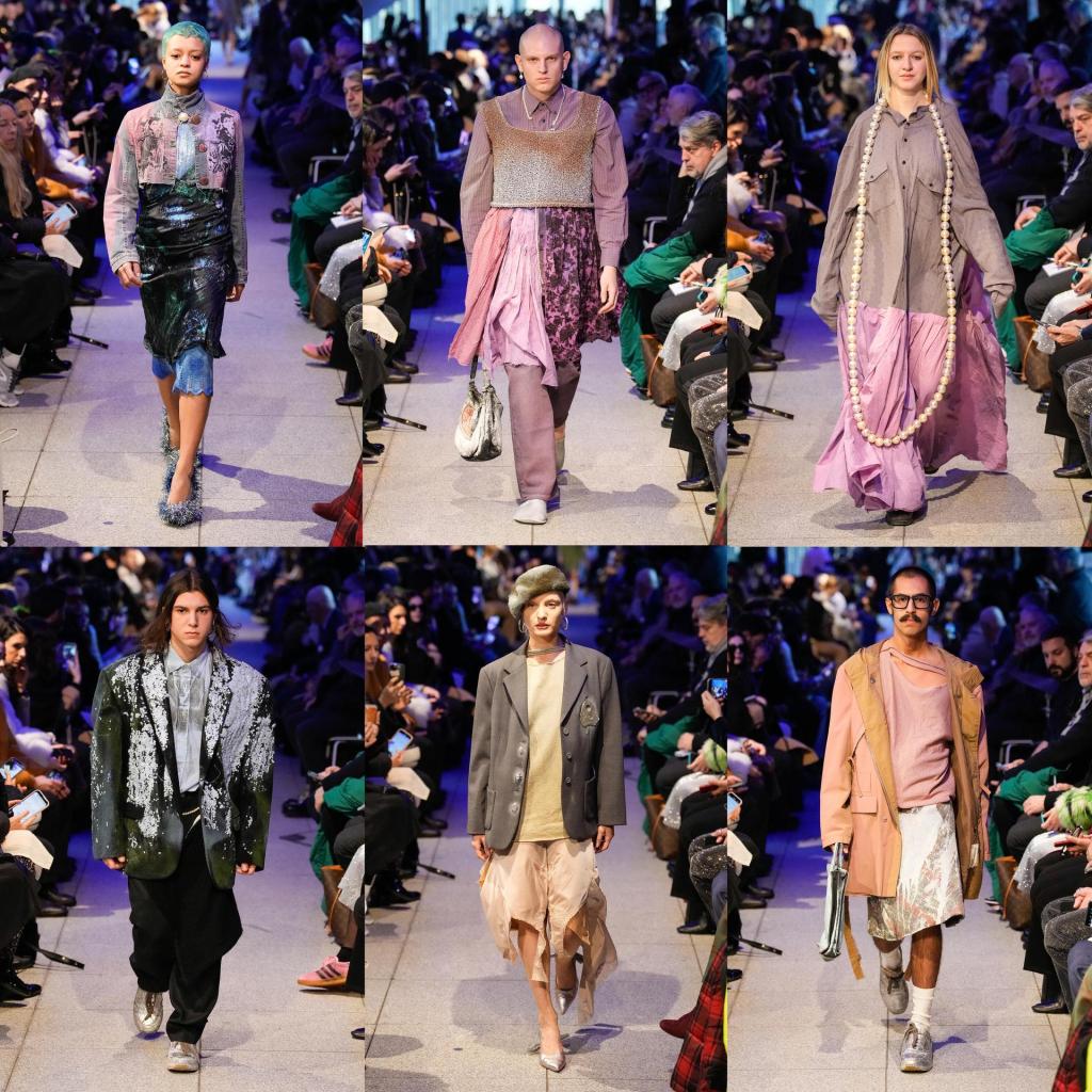 ‘La nanna’ è quel momento magico in cui si passa dalla veglia al sonno, dove tutto si sfuma, i contorni sono sfocati, i colori sbiadiscono, la coscienza si assopisce. Il momento in cui, come racconta James Joyce, arriva il flusso di coscienza. Gli abiti sono sempre costruiti e decostruiti con la tecnica dell’upcycling, ma vogliamo far capire che l’upcycling è un mezzo e non un fine, le storie che raccontiamo attraverso questa tecnica sono ben più articolate. Banana Yoshimoto con il suo libro ‘Sonno profondo’ del 1989, ci ha guidato nel concepire il sonno come protezione e cura per i dolori dell’anima. Questo si traduce in una palette di colori sbiadita, creata tingendo i capi già assemblati e osservando le diverse sfumature che ne risultavano. I capi sembrano impolverati, o bagnati di pioggia grazie a vecchie paillettes opache e vernici argentate. Gli angoli si smussano, la patina del tempo che passa e modifica gli oggetti e le persone si posa sulla sartoria tradizionale maschile, da sempre nel nostro DNA. Le perle si appoggiano su tessuti infeltriti e vecchie lenzuola come la luce della luna. A fare un pisolino con noi abbiamo invitato Sue Clowes, che in un rifugio lontano dal rumore ha stampato a mano con la sua visione sognante i capi in denim della collezione.