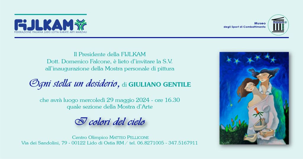 “Ogni Stella Un Desiderio” è il titolo della prossima mostra personale di pittura del caro amico Giuliano Gentile, che si terrà dal 29 maggio al 29 settembre, presso il Centro Olimpico Matteo Pellicone, Via Sandolini 79 – 00122 Lido di Ostia RM.