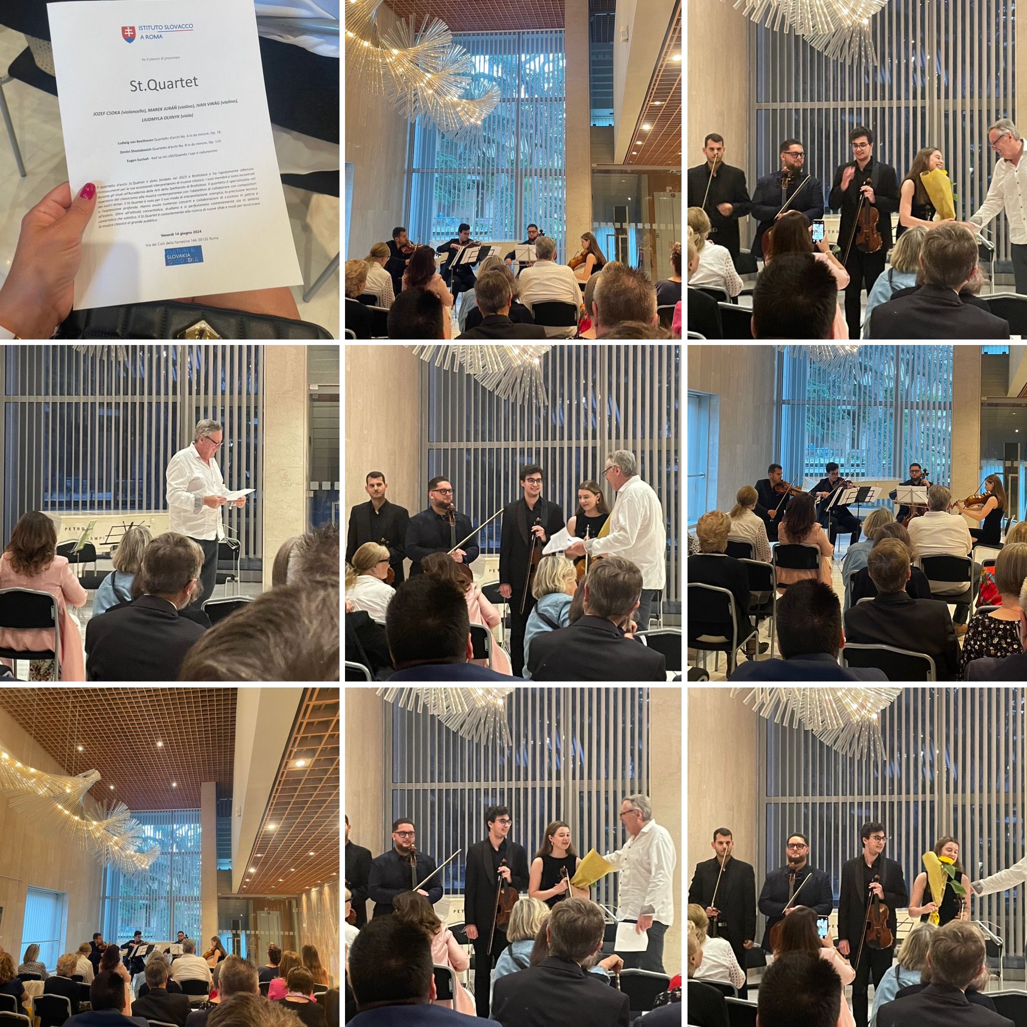 Il quartetto d’archi St. Quartet è stato fondato nel 2023 a Bratislava e ha rapidamente ottenuto riconoscimenti per le sue eccezionali interpretazioni di musica classica. I suoi membri si sono incontrati durante gli studi all’Accademia delle Arti dello Spettacolo di Bratislava. Il quartetto è specializzato nel repertorio dal classicismo alla musica contemporanea con l’obbiettivo di collaborare con compositori dei nostri tempi. Il St. Quartet è noto per il suo modo di interpretazione energica, la precisione tecnica e l’espressione profonda. Hanno avuto numerosi concerti e collaborazioni di successo in patria e all’estero. Oltre all’attività concertistica, studiano e si perfezionano costantemente sia in ambito cameristico che solistico. Il St. Quartet è costantemente alla ricerca di nuove sfide e modi per avvicinare la musica classica al grande pubblico e ci ha lasciato senza fiato! In alcuni momenti mi è sembrato di ascolare un’intera orchestra, sensazione condivisa da altri partecipanti durante le Vin d’Honneur a fine serata.