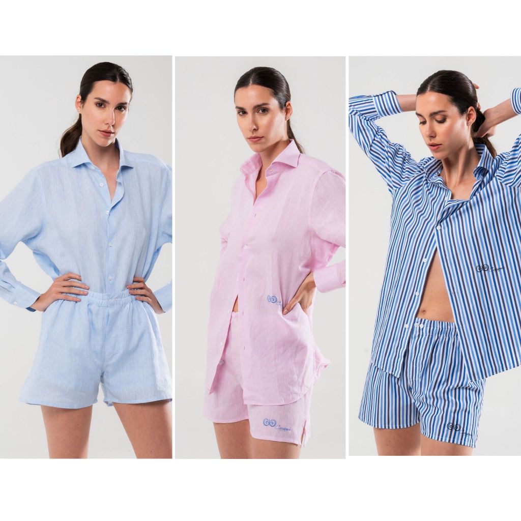 Nella versione in cotone le camice sono nei classici rigati, azzurro, verde e rosso mentre quelle in lino sono total block rosa e azzurro Tutte sono proposte con il boxer abbinato da indossare come loungewear e come shorts