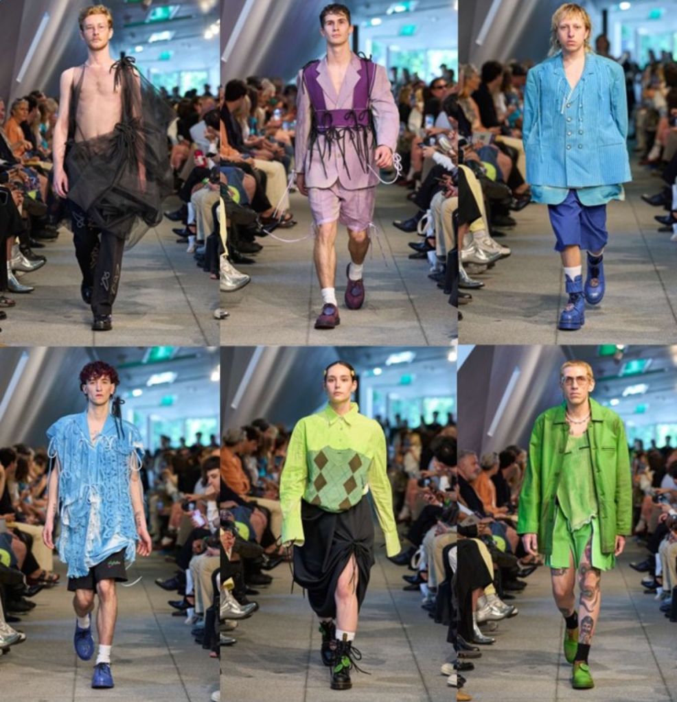 La questione di principio crea un corto circuito nella comunicazione e nelle relazioni interpersonali: quando viene giocata questa carta, che prevarica anche il buon senso, porgiamo al nostro interlocutore un contenitore vuoto e creiamo un ‘nodo’ comunicativo difficilmente districabile. Non vogliamo essere ‘politici’ nel nostro racconto, ma abbiamo sentito l’esigenza di raccontare metaforicamente uno stato di cose: oggi non utilizzare qualsiasi mezzo (moda compresa) per accendere un pensiero critico sarebbe un atto criminale. E sono proprio i nodi che abbiamo usato come tecnica sartoriale per dare concretezza al nostro pensiero, illuminati dal libro ’Nodi’ scritto dallo psicologo Ronald D. Laing nel 1970: gli abiti sono stati creati quasi esclusivamente annodando: lembi di tessuto, coulisse, stringhe e lacci che danno contemporaneamente un senso di unione e ornamento ma anche di costrizione. La collezione è strutturata in quattro colori ‘nervosi’, oltre al nero assoluto le sfumature del blu marino, del verde acido e del viola, sviluppando l’effetto di tintura ‘sbagliata’ iniziato con la scorsa stagione. AUSTRALIAN, storico marchio italiano di abbigliamento da tennis prima e oggi sportivo nell’accezione più ampia (e con un piede anche nella club-culture), ci ha dato accesso a un incredibile deadstock di capi semi-assemblati e tessuti per i nostri pezzi upcycled. Inoltre, insieme al team creativo del brand abbiamo sviluppato una capsule di capi tecnici neri/neon, per la prima volta riproducibili, che faranno anche parte della main-collection Australian SS25.
