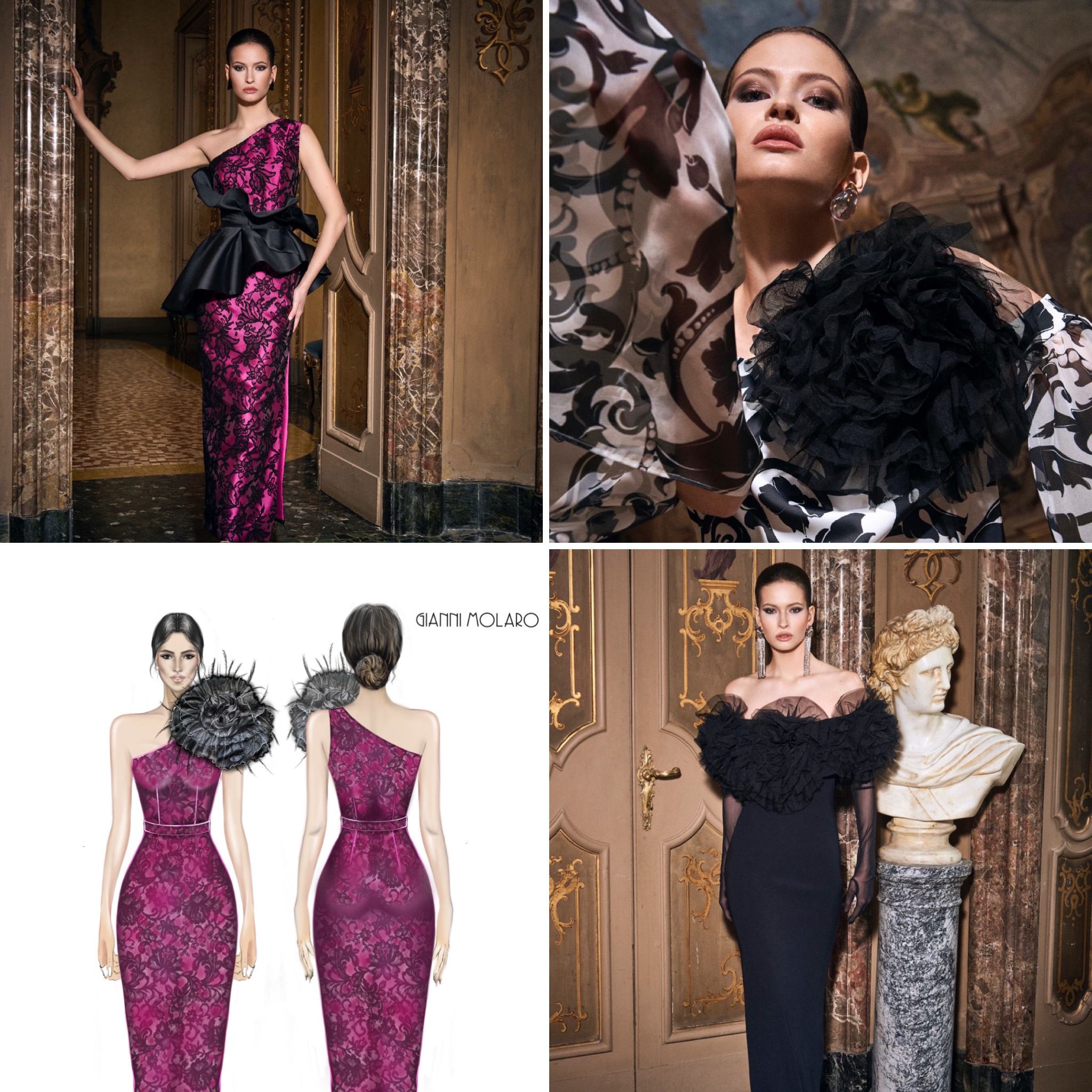 La prima è Tamara de Lempicka, pittrice polacca ed icona femminile della Parigi Anni Venti che ha rappresentato meglio di chiunque altro tutta l’atmosfera Belle Epoque e la trasgressione. Dalida è l’altra musa dello stilista, una donna che conquistò il mondo grazie al suo fascino e alle sue doti canore ed espressive. Le proposte si sviluppano in long dress ricercati in cui il mikado fascia la silhouette con pizzi chantilly a contrasto, ma anche abiti in satin morbidi sia in tinta unita che in stampe bianche e nere disegnate dallo stesso couturier. La palette cromatica predominante è quella dei bianchi e dei neri coadiuvati dal verde smeraldo e dal ciclamino. Fil rouge della collezione Noble Vanité è la perla che predomina nelle stampe, nei ricami, nelle acconciature e sui polsi delle suggestive creazioni. Per Gianni Molaro la perla rappresenta uno dei gioielli più raffinati, molto più dei diamanti o degli smeraldi. “La mia donna rappresenta una femminilità emancipata che vuole apparire in un modo interessante, è una donna padrona di sé stessa.”- chiosa il designer. In Noble Vanité c’è grande enfasi sui dettagli e sugli accessori. Gli abiti infatti sono impreziositi da velette e da piume, queste ultime elemento cardine dell’haute couture. La piuma rappresenta il vezzo, la vanità del corpo. Compaiono stole e cinture dai grandi volumi, petali e fiori di organza che creano strutture sulle spalle adagiati in maniera asimmetrica. La stola con pieghe, indossata come una cintura, crea volume tra la spalla e il punto vita. Gli spacchi sono surreali, le scollature e le trasparenze perfettamente inserite, è un’eleganza sussurrata. “Io che vengo dalla sposa, in questa collezione, ho fatto un enorme lavoro di sottrazione. Il mio intento rimane sempre quello di vestire qualsiasi fisicità e donne di carattere.”- dichiara Molaro.