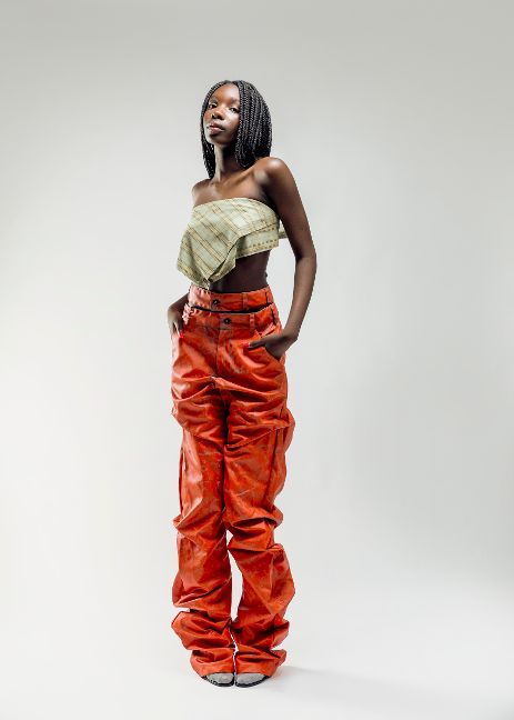 Eyelet Milano, in occasione della Festa di Halloween propone il capo perfetto per l’occasione: il jeans baggy arricciato, realizzato con eco- resina solubile nel colore arancione.