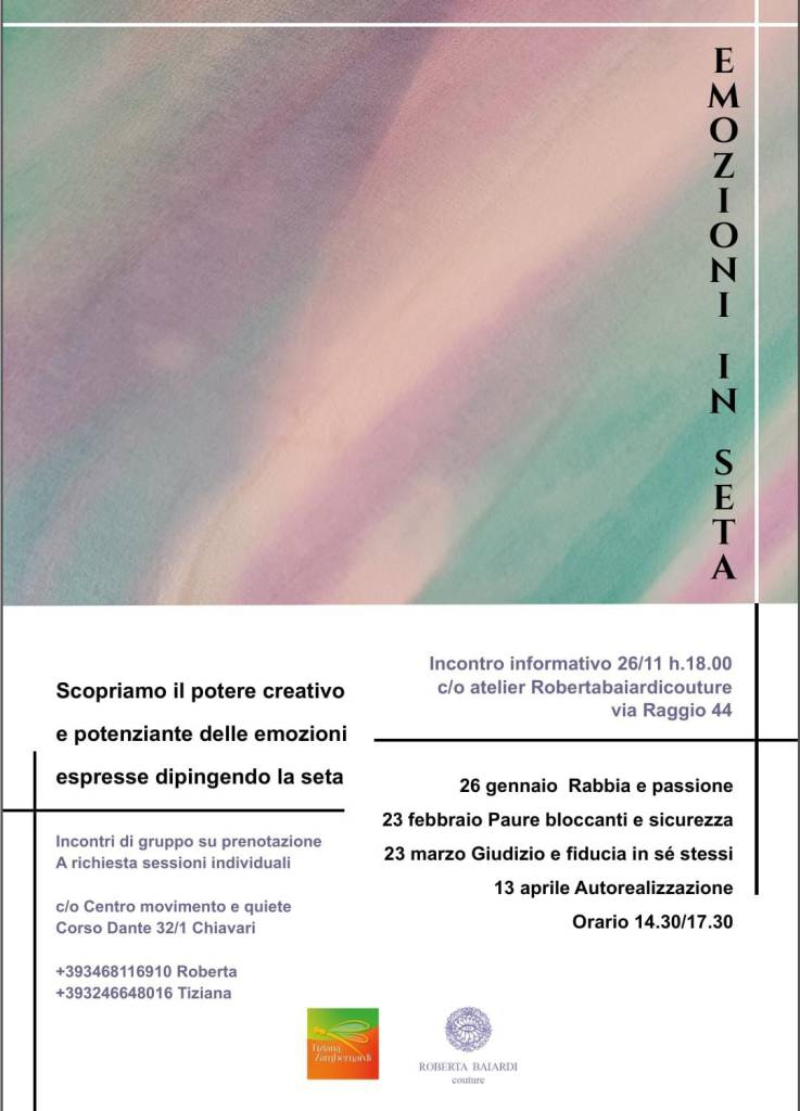 Si tratta di 4 giornate a tema dove si andrà a sbloccare l’emozione analizzata e a farla fluire tramite l’uso dei colori in un dipinto su seta che poi ognuno si porterà a casa. Info e date sulla locandina a seguire.