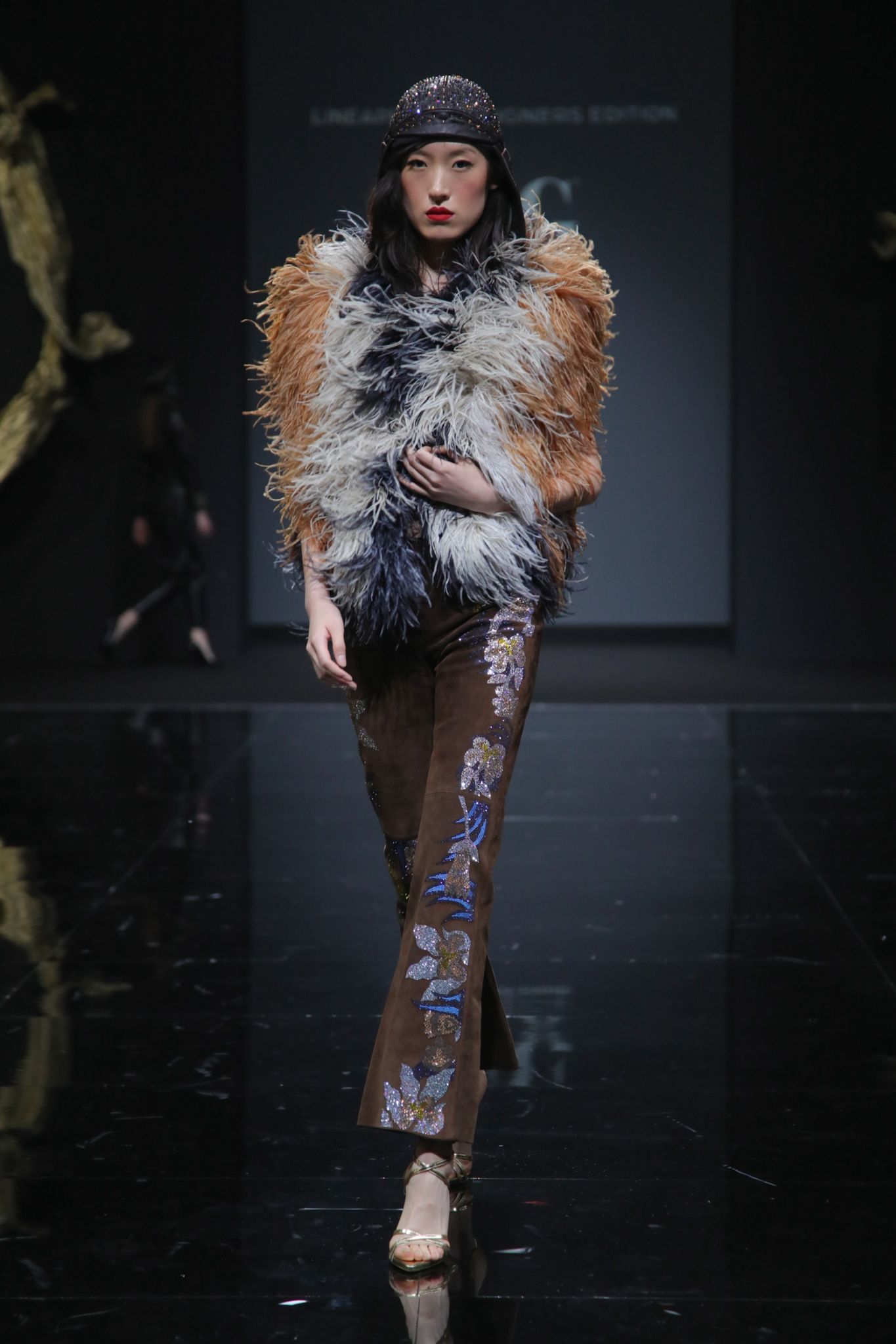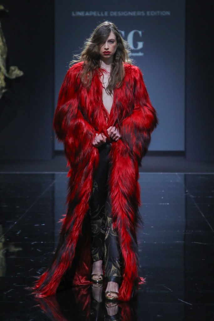 “Per questa nuova collezione mi sono lasciato suggestionare dal mondo dei motori poiché lo spirito rock e trasgressivo che aleggia sulle due ruote si amalgama con l’audacia e la sensualità delle mie creazioni”- chiosa Anton Giulio Grande- In passerella 38 look, di cui 24 donna e 14 uomo, outfits con sofisticate lavorazioni, giubbotti, cappotti, parka, vestaglie, mantelle realizzate con pelle, pelliccia e piume dal sapore rock che si sposano con il rombo dei motori, per un mood moderno ed accattivante. Tra i capi cult della collezione, applaudita, tra gli altri, da Sabrina Salerno, Arturo Mariani, Stefano Sala, spicca una mantella bianca bordata di pelliccia, preziosissima di pizzo, interamente ricamata con cristalli, jais, swarovski, perline e paillettes. La palette cromatica vira dal nero profondo, al rosso, all’avario, fino alle sfumature del marrone.