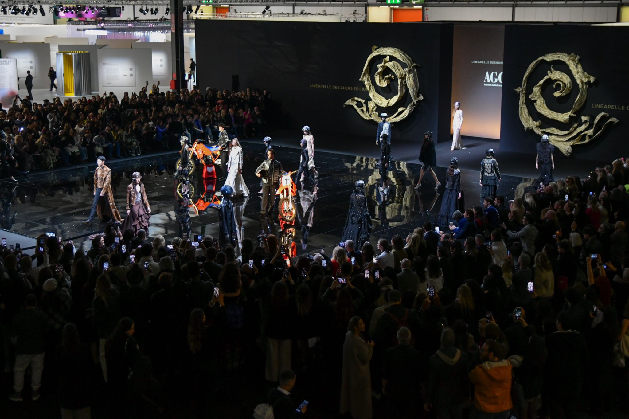Davvero una sfilata in grande quella presentata dal talentuoso couturier Anton Giulio Grande di fronte ad oltre milleduecento ospiti! Ha avuto luogo Martedì 25 febbraio 2025 la collezione Fall/Winter 25-26 intitolata AGG on the road a Fiera Milano Rho durante la Milano Fashion Week. La sfilata è stata organizzata in collaborazione con Lineapelle-Unic Concerie Italiane ed ha messo in mostra la maestria del celebre stilista calabrese che per l’occasione ha festeggiato venticinque anni di carriera nell’haute couture ed ha realizzato dei look ispirati ad una donna rock che viaggia in moto e proprio sulle due ruote vive la sua vita in maniera anticonformista, va persino all’altare a bordo di una motocicletta e possiede un intero guardaroba, studiato per ogni occasione per essere sfoggiato a bordo di una moto.
