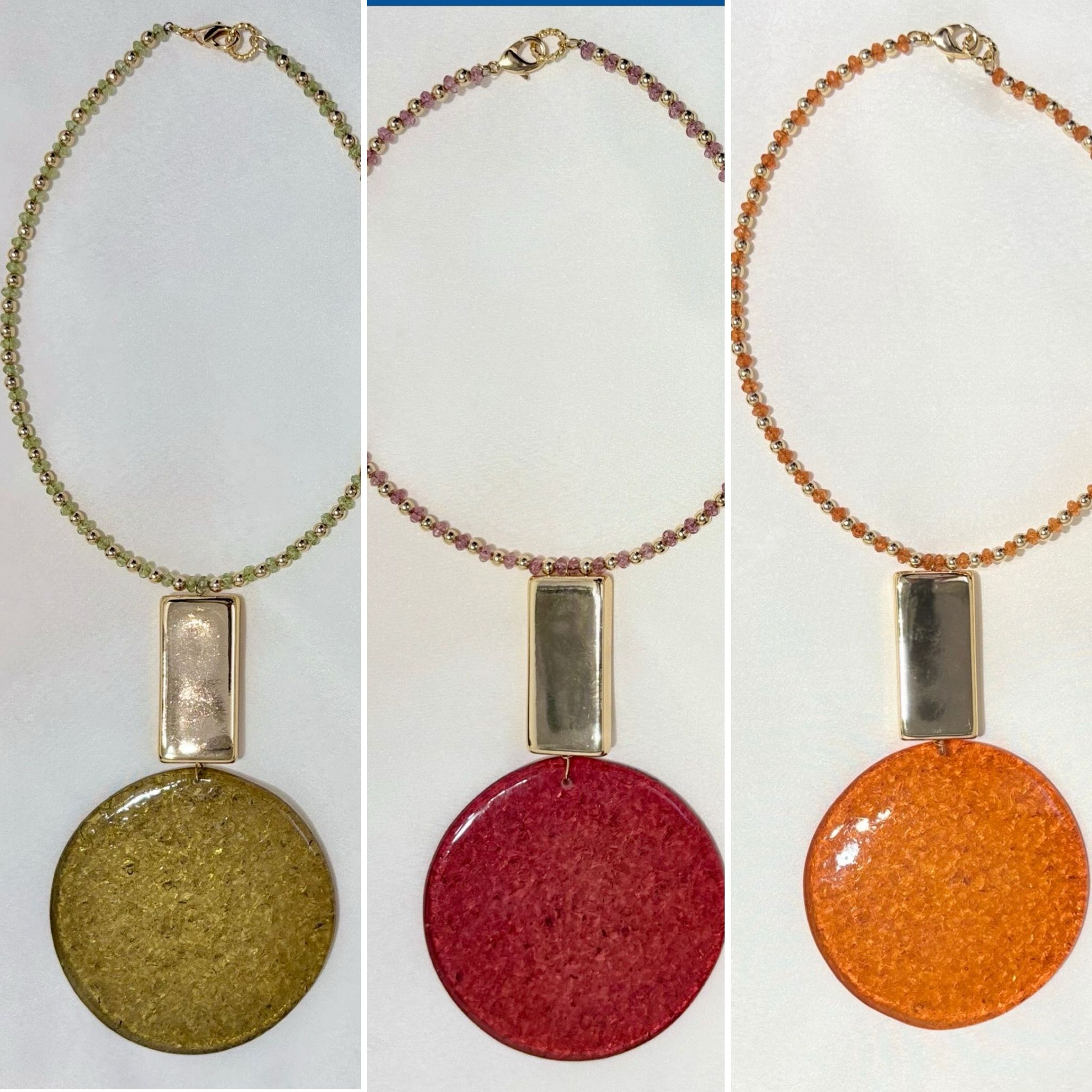 I riflessi dorati e argentati giocano con forme essenziali e strutturate, ricordando le installazioni luminose dell’arte cinetica. Gli accenti cromatici – dall’arancio vibrante al fucsia, dal rubino intenso al verde chiaro – evocano la forza espressiva delle tele astratte, mentre le catene in resina color cammello e gli anelli con foglia dorata richiamano texture materiche e sofisticate.