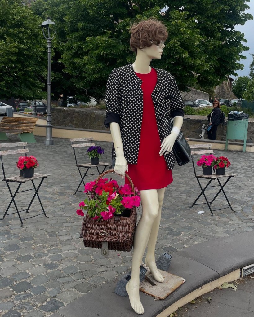 Sul piazzale che guarda il lago, un manichino a grandezza naturale, vestito come una donna degli anni ’60 – epoca in cui l’Italia sognava e costruiva