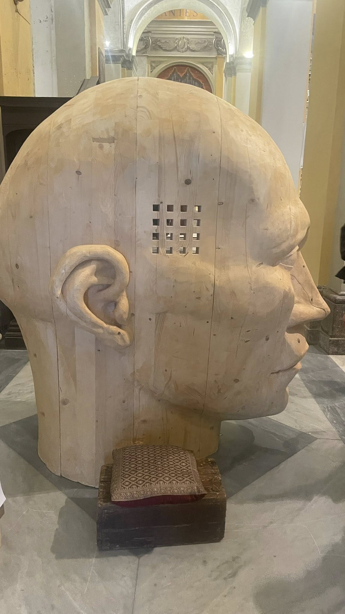 Confessionale è una testa cava con al suo interno una seduta. E una materica presenza che abbraccia il confessore. In questo abbracciare il confessore e il confessato si fondono e il Confessionale diventa un “io” che si scompone. Attraverso piccoli fori posti sulla tempia conscio e subconscio si raccontano in segreto i lati più bui.