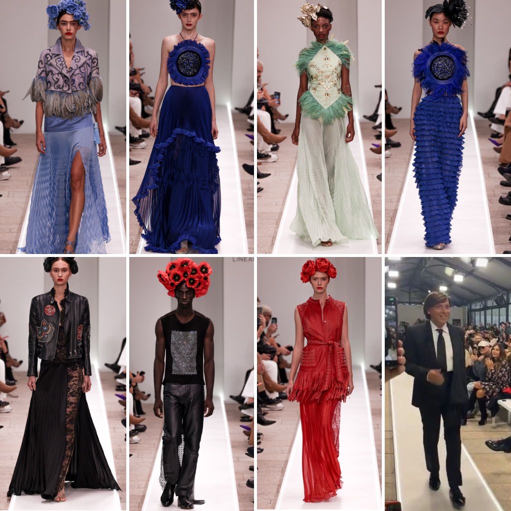 - Gli abiti lunghi seguono la lunghezza delle gonne. I giacchini di pelle sono ricamati in materiali ultra preziosi: piume, strass, swarovski, inserti di pellame con lavorazioni geometriche e contrasti di colore e materiali. I corpini sono realizzati anch’essi con delle forme geometriche bordate di piume in tinta con la pelle, troviamo anche i corpini asimmetrici in cavallino, pelle e camoscio. I gilet smanicati e iper ricamati richiamano nei motivi la figura della Kahlo. La palette cromatica spazia dal nero, nuance cara allo stilista, fino ai bluette, celeste, verde acqua. I colori pastello si aprono in una ruota immensa di plissè con lavorazioni geometriche. Ad impreziosire i look in passerella ci saranno copricapi unici, realizzati interamente a mano da Florilegio con fiori di carta intagliati e dipinti, frutto di un lavoro corale che unisce maestria e visione. I fiori per la Kahlo non erano solo elementi decorativi, ma un mezzo per esplorare e rappresentare la bellezza, la vita e le emozioni, anche quelle più difficili come il dolore, al punto che affermava: “Dipingo i fiori per non farli morire” .