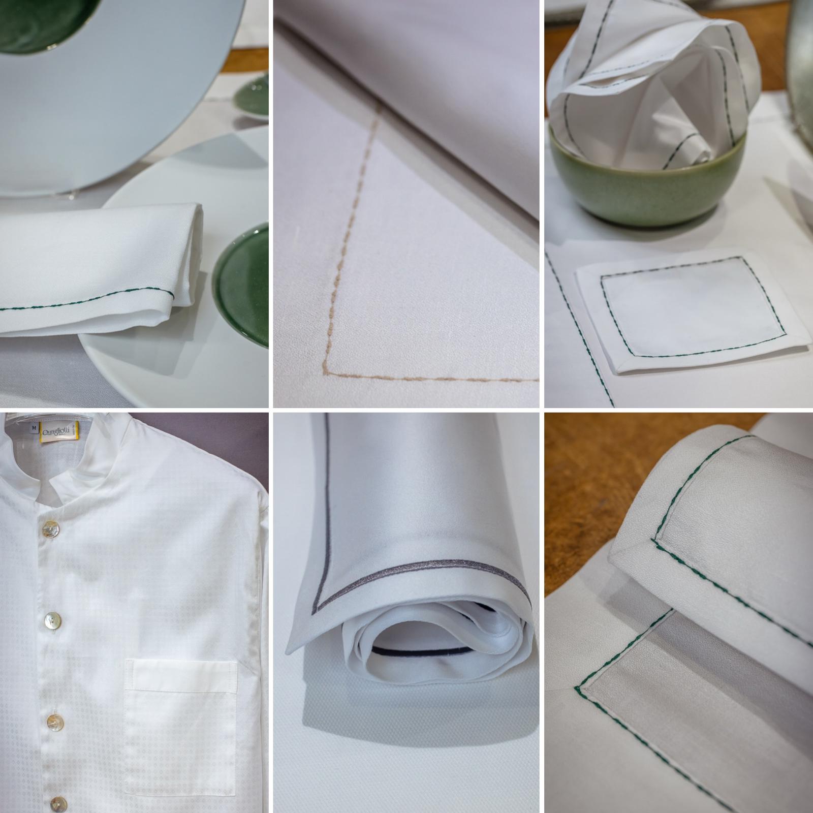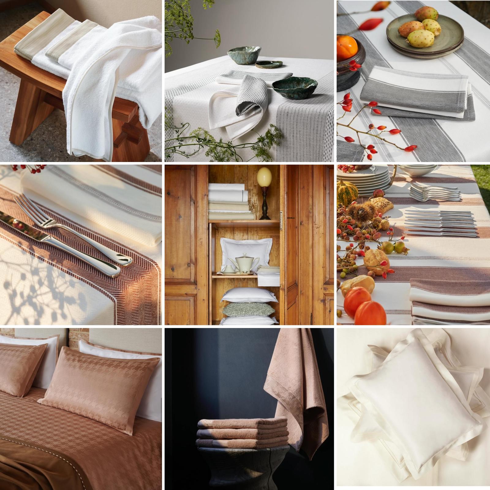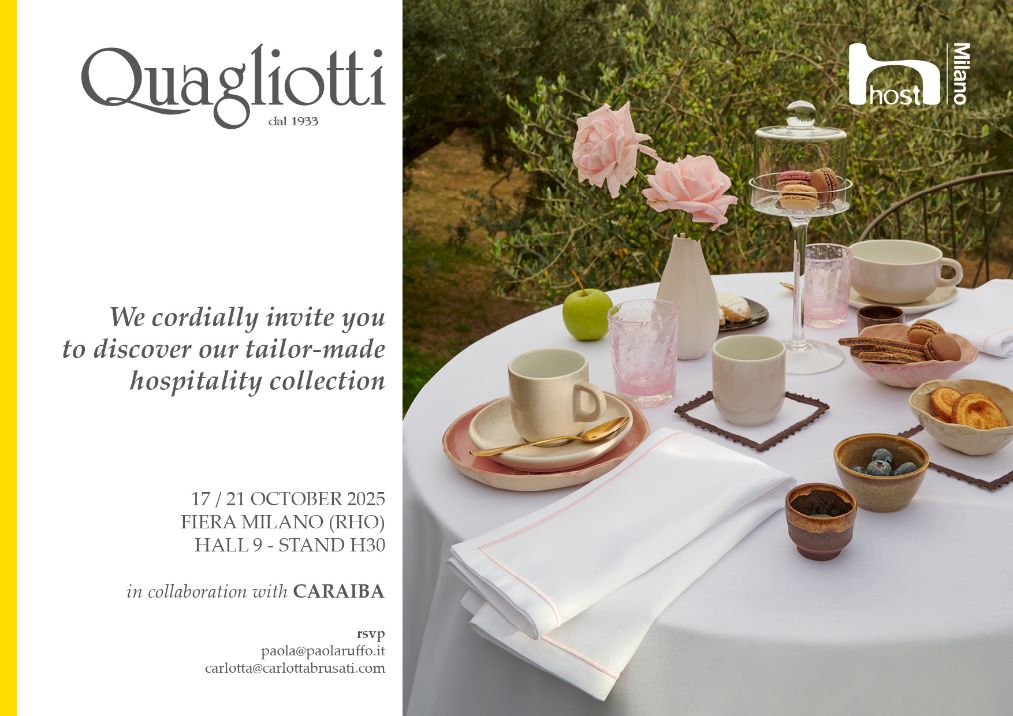 In occasione di Host Milano, Quagliotti presenta le nuove creazioni dedicate al mondo della tavola, del bagno e del letto. Per la tavola, una raffinata lavorazione ad impuntura disegna un ricamo su crespo di lino e cotone 100 % sottolineando la precisione del dettaglio. Per il bagno, l’accappatoio kimono accosta la morbidezza della spugna alla texture naturale di lino e cotone. Per il letto, il pigiama in raso di cotone liscio o jaquard, con collo coreano e linee essenziali, reinterpreta la tradizione con sobria eleganza. La vestaglia, modello kimono in purissimo cotone effetto nido d’ape, completa l’insieme con un equilibrio perfetto di leggerezza e comfort. Ogni creazione nasce da uno studio che unisce forma e sensazione, pensato per luoghi in cui l’accoglienza si riconosce al tatto, sentendosi a casa anche fuori casa.